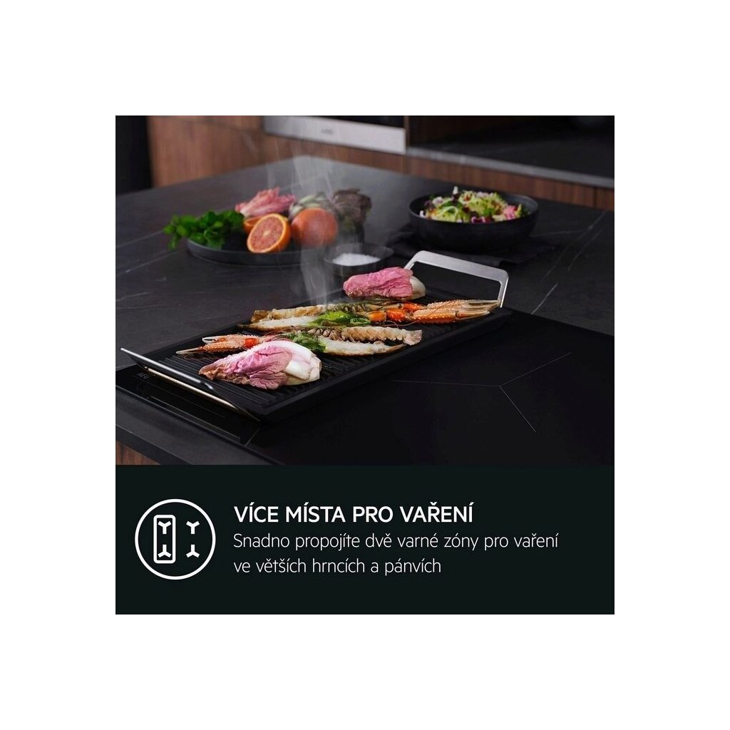 Funkce Bridge umožňuje propojit dvě varné zóny do jedné velké plochy – ideální pro větší hrnce, pekáče nebo grilovací planchu.