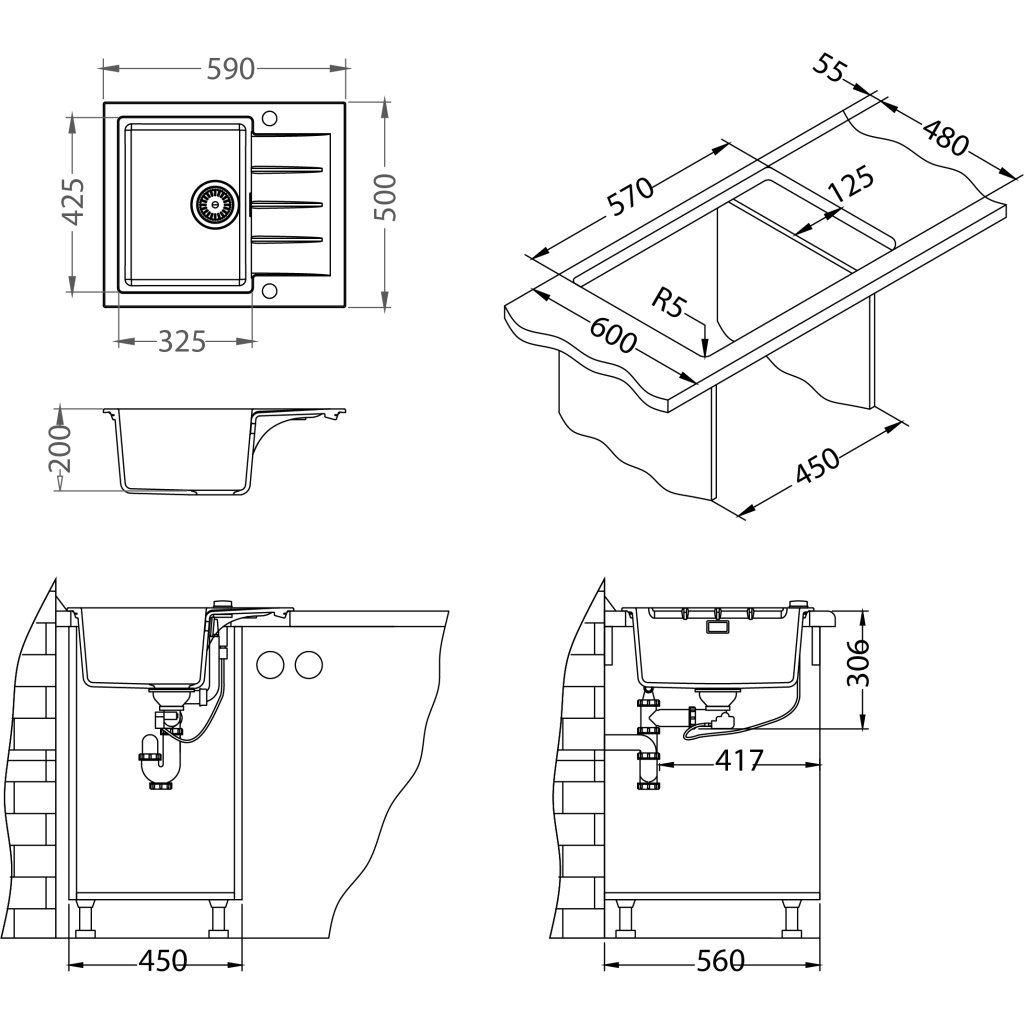 Vestavěný dřez, univerzál. Provedení : granitový dřez s odkapem Vnější rozměr: 590 x 500 mm Rozměr vaničky: 325 x 425 x 198 mm Exentrický sítkový ventil v černém provedení 3 1/2 s přepadem, sifon pro úsporu místa s odbočkou na myčku Úchyty a těsnění pro upevnění dřezu v balení S otvorem pro baterii Návod pro instalaci v obrázcích na obale Instalace do skříňky o šířce 450 mm Váha: 11,5 kg Rozměry balení ( mm ): 714x598x263Doplňkové parametry