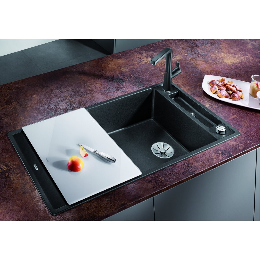 Skleněná krájecí deska, odtoková armatura s prostorově úspornou trubkou, 2 x 3 1/2“ košový ventil InFino s táhlem