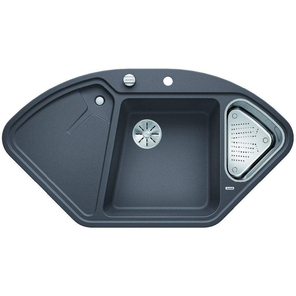 Víceúčelová nerezová miska, odtoková armatura InFino s prostorově úspornou trubkou, dva 3 1/2‘‘ ventily, excentrické ovládání pro hlavní dřez