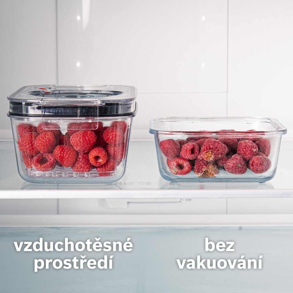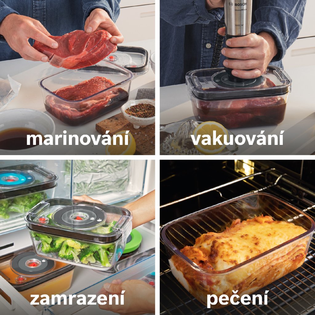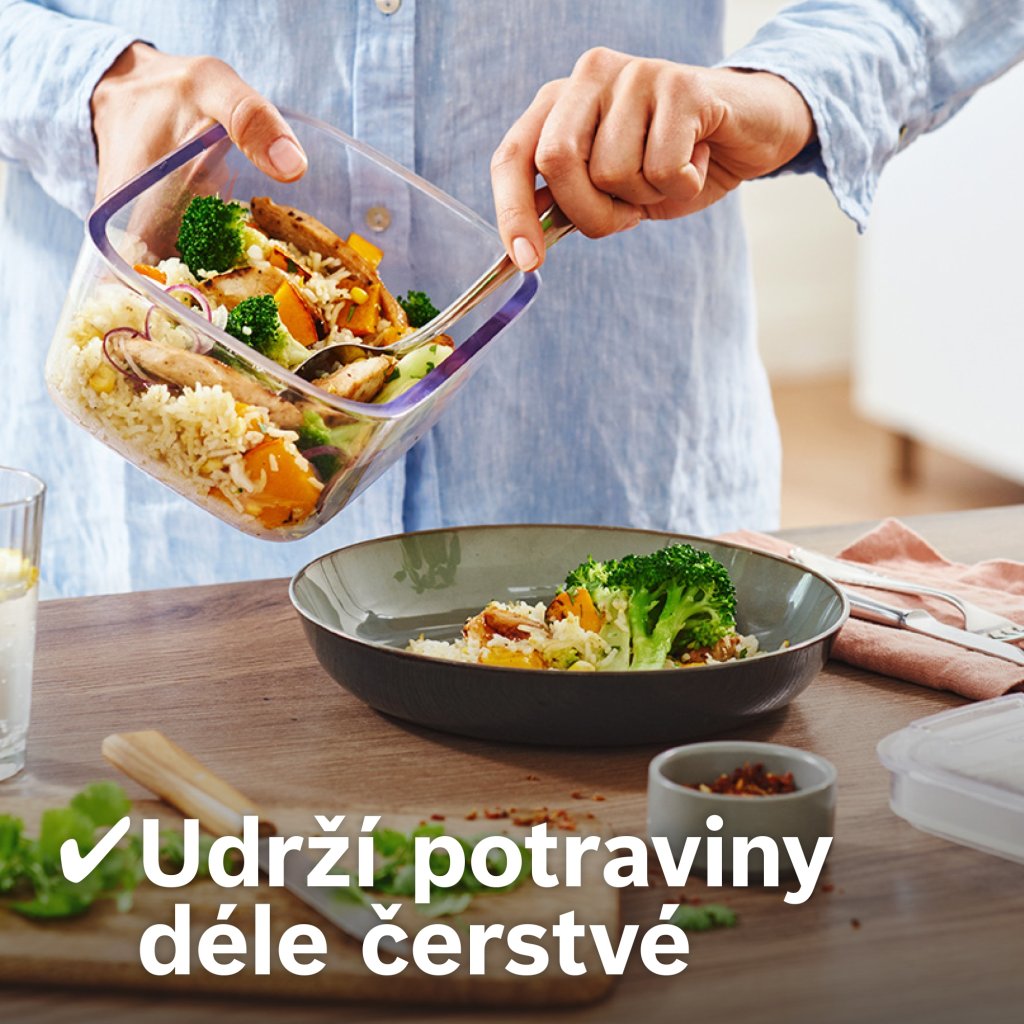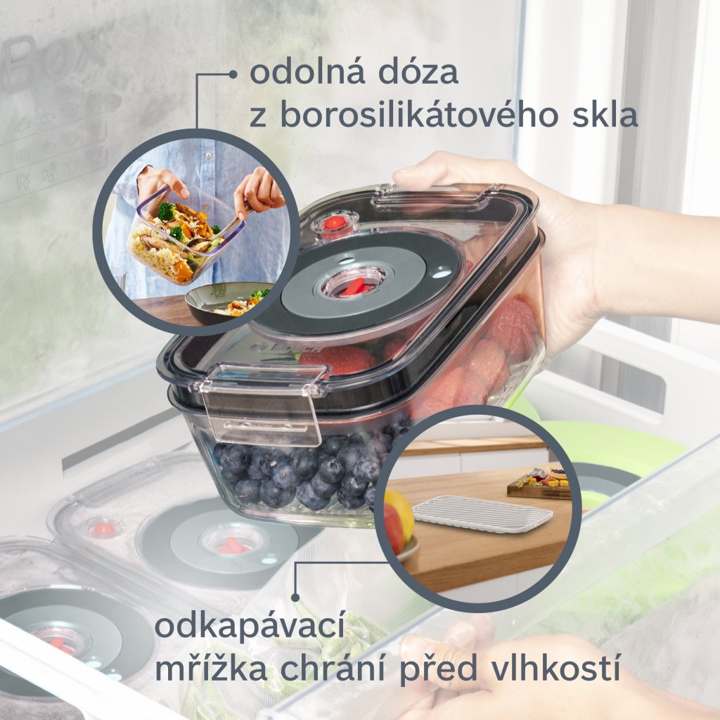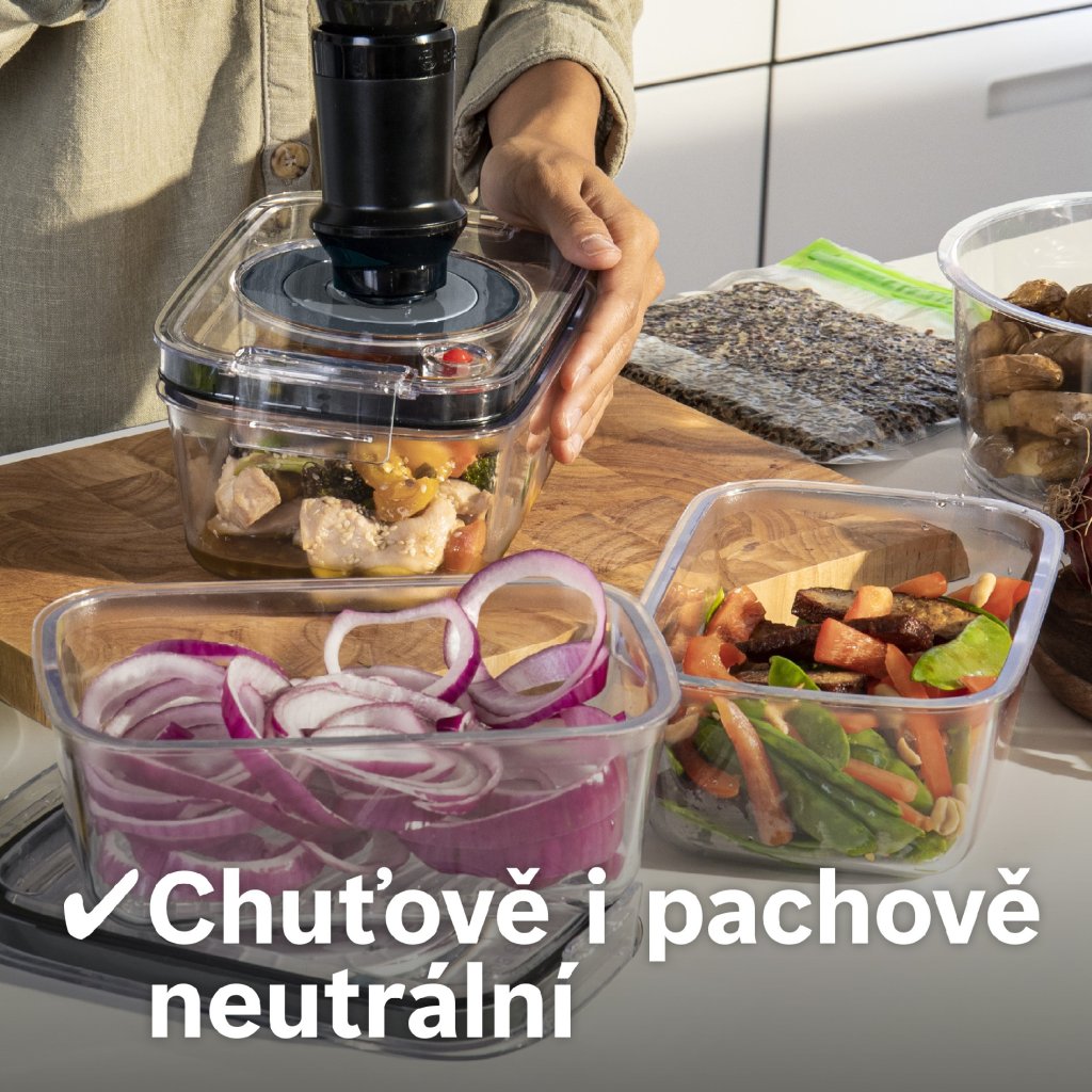 - Odolné víko vakuové dózy je vyrobené z tritanu: je chuťově i pachově neutrální a odolné proti rozbití.