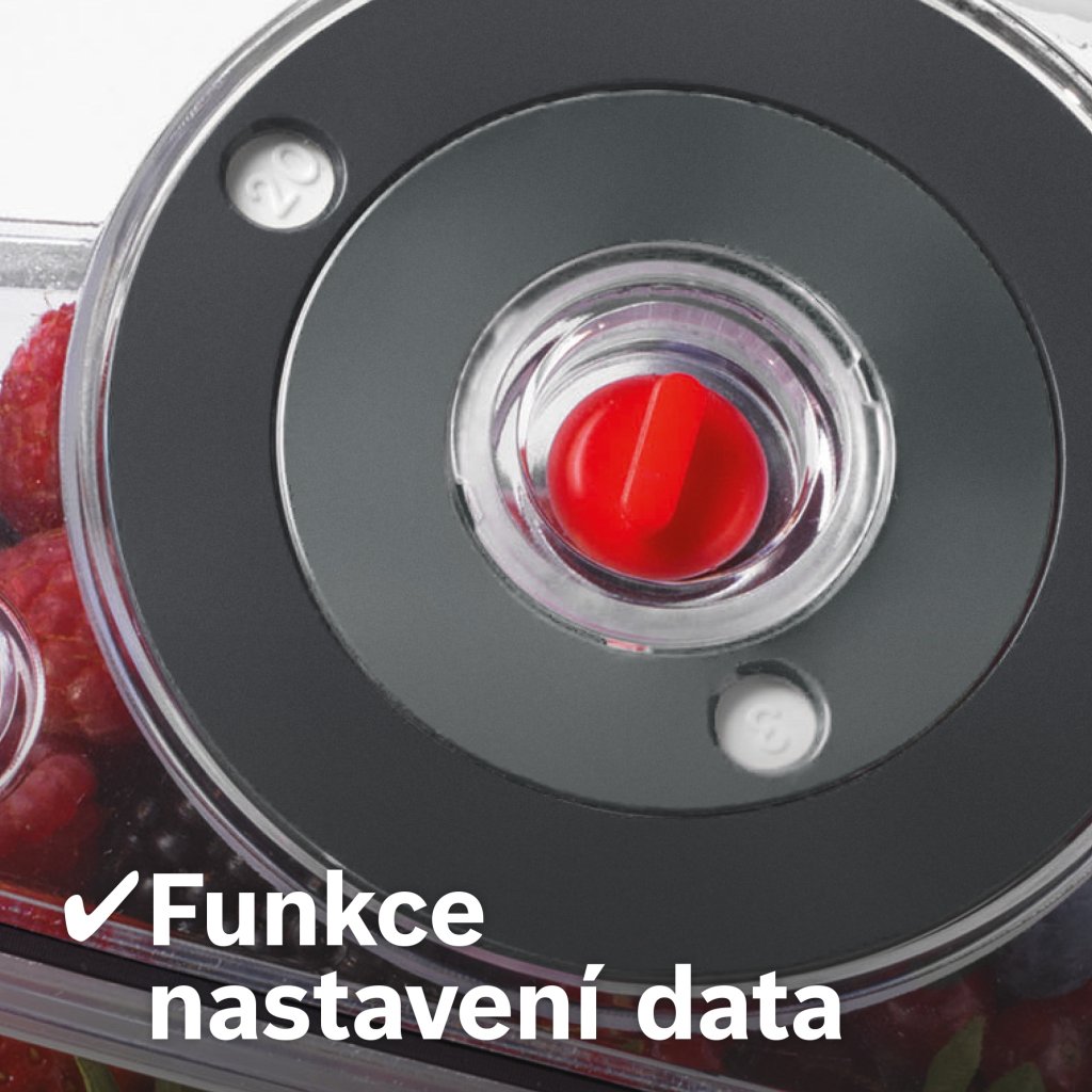 - Funkce nastavení data: den a měsíc uskladnění nastavíte jednoduše otočnými kolečky na víčku nádoby.