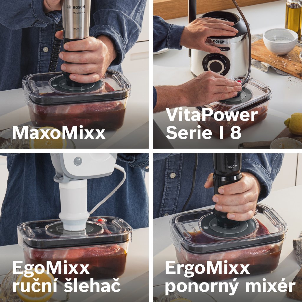 Výkonný vakuovací nástavec: odstraní vzduch z vakuové nádoby nebo sáčku; pro tyčový mixér Bosch ErgoMixx.