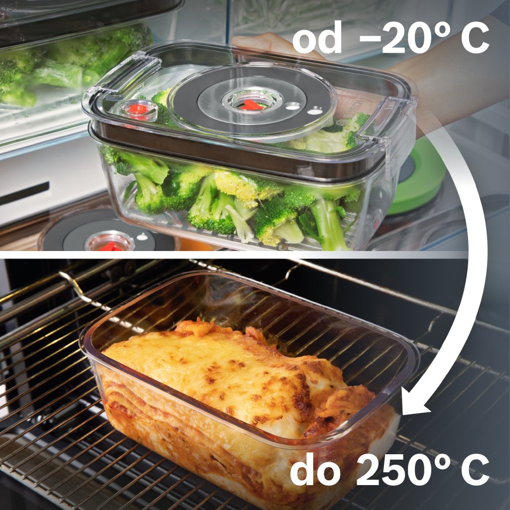 - Robustní vakuová dóza vyrobená z borosilikátového skla: odolná vůči teplotám (- 20 °C až + 250 °C), vhodná do mrazničky, trouby i mikrovlnné trouby.