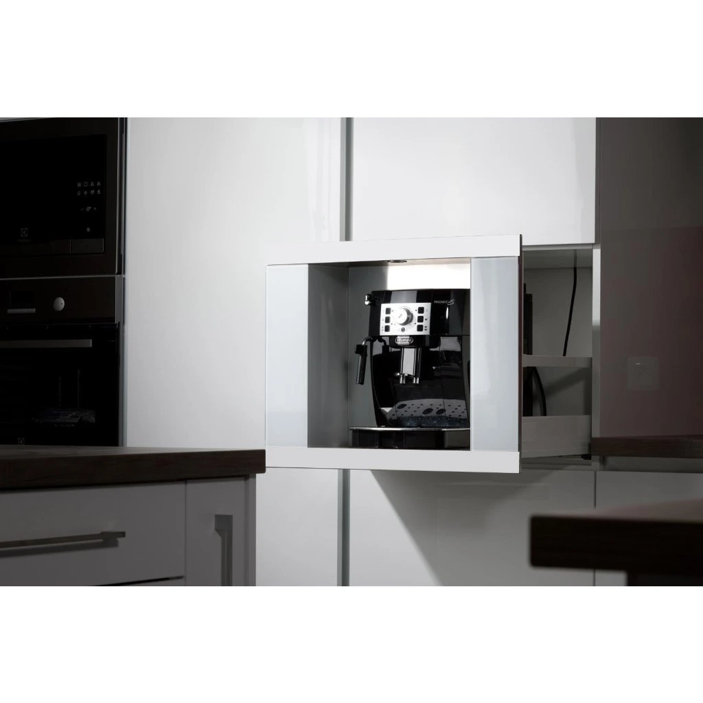 - Vestavná schránka s teleskopickým výsuvem pro volně stojící kávovary.