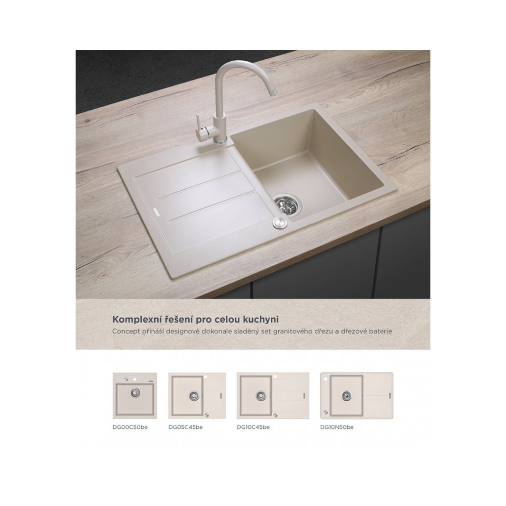Dřezová baterie BDG3334be je zpracována v jednoduchém a elegantním designu. Povrch baterie tvoří kvalitní barva s designem granitového povrchu v kombinaci s lesklými chromovými detaily. Dokonale ladí s béžovými granitovými dřezy Concept. Tento model nabízí další 4 barevné varianty: černá (BDG3334bc), bílá (BDG3334wh), tmavě šedá (BDG3334dg) a lesklá chromová (BDC3334).