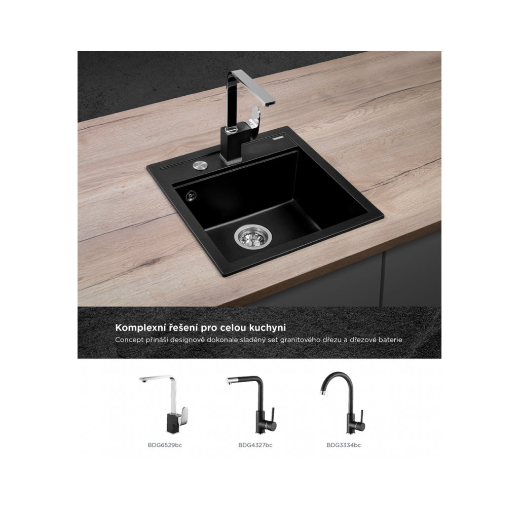 Atraktivní vzhled, kvalitní zpracování, vysoká odolnost a snadná údržba, to jsou hlavní přednosti granitových dřezů Concept. Perfektně zapadnou do každé kuchyně a v kombinaci s bateriemi Concept tvoří dokonale sladěný celek. Model DG00C50bc je součástí designové řady CUBIS, kterou spojují moderní hranaté linie a v kuchyni působí velmi nadčasovým a elegantním dojmem.