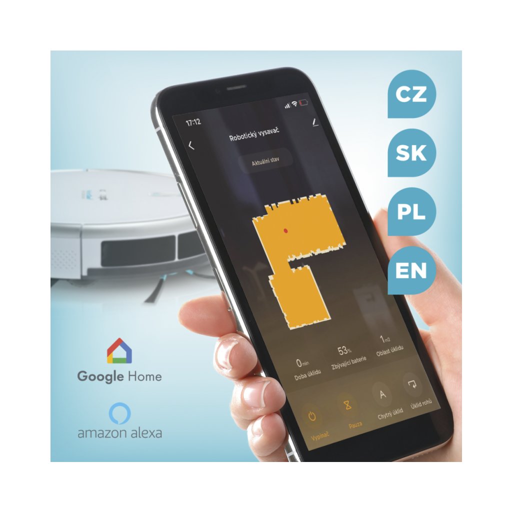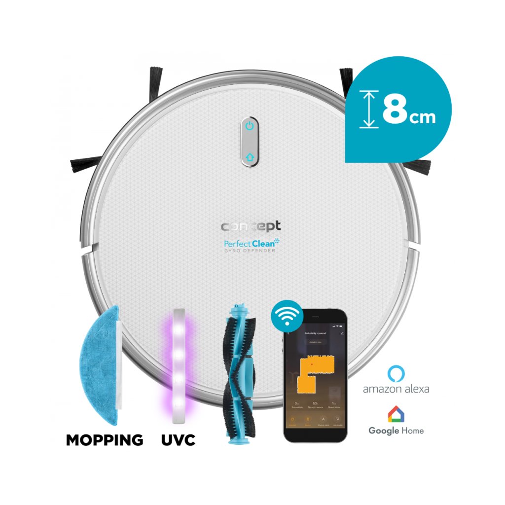 Robota je možné ovládat přes aplikaci Concept Home, která je v češtině a zdarma dostupná pro iOS a Android. Pomocí aplikace můžete naplánovat úklid kdykoliv a odkudkoliv a zároveň v reálném čase sledovat, kolik toho uklidil a kde se zrovna nachází. I když nebudete zrovna doma, úklid domácnosti budete mít neustále pod kontrolou. Přes domácího asistenta Alexu nebo Google Home můžete vysavač ovládat i hlasem. A pokud nejste fanoušci aplikací nebo nemáte chytrý telefon, můžete ho plně ovládat také pomocí dálkového ovladače.