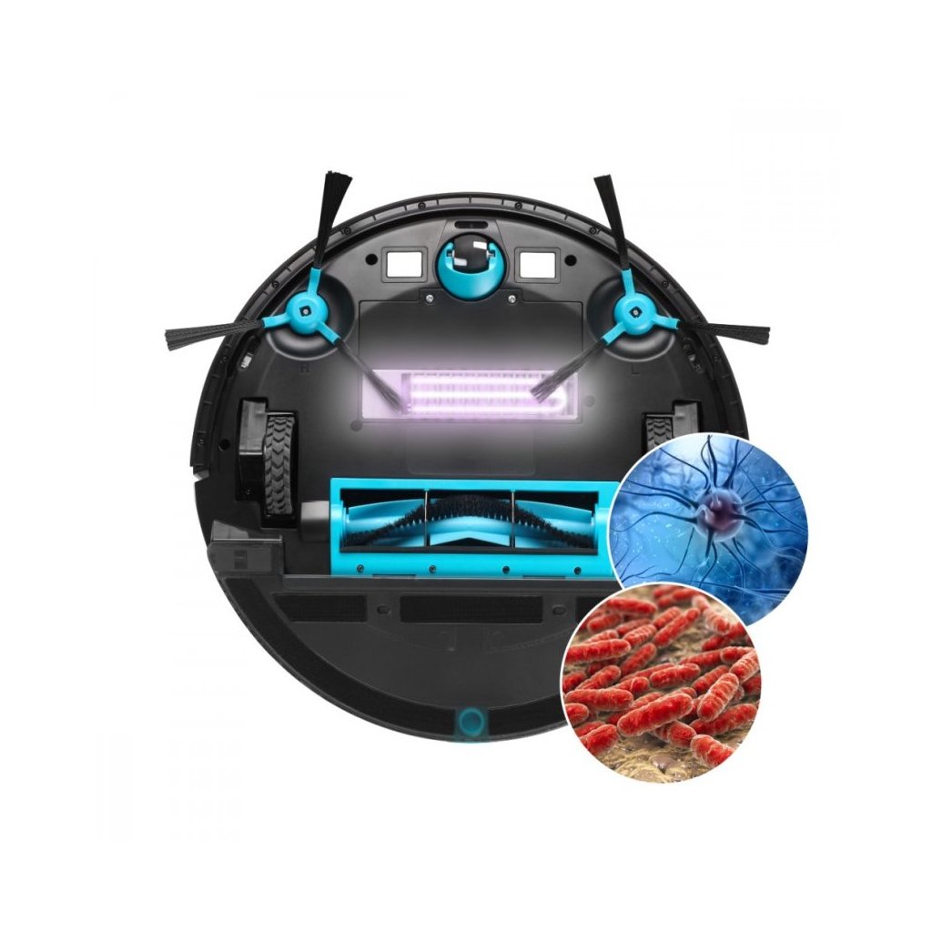 Robotický vysavač VR2020 je vybaven UVC sterilizační technologií. Ultrafialové záření typu C narušuje buněčnou strukturu DNA bakterií, virů, plísní a dalších mikrobů, a tím brání jejich dalšímu množení. Běžně se využívá např. k dezinfekci vody, vzduchu nebo v potravinářském a farmaceutickém průmyslu. S tímto vysavačem budete mít jistotu dokonalé čistoty bez nutnosti použití chemických prostředků. Režim sterilizace můžete ovládat přes mobilní aplikaci a výhradně s nasazeným prachovým zásobníkem. Vysavač vypne sání, zmenší rychlost pohybu na poloviční výkon a zároveň sníží otáčky hlavního kartáče i bočních kartáčků. UVC světlo můžete aktivovat také během standardního úklidu.