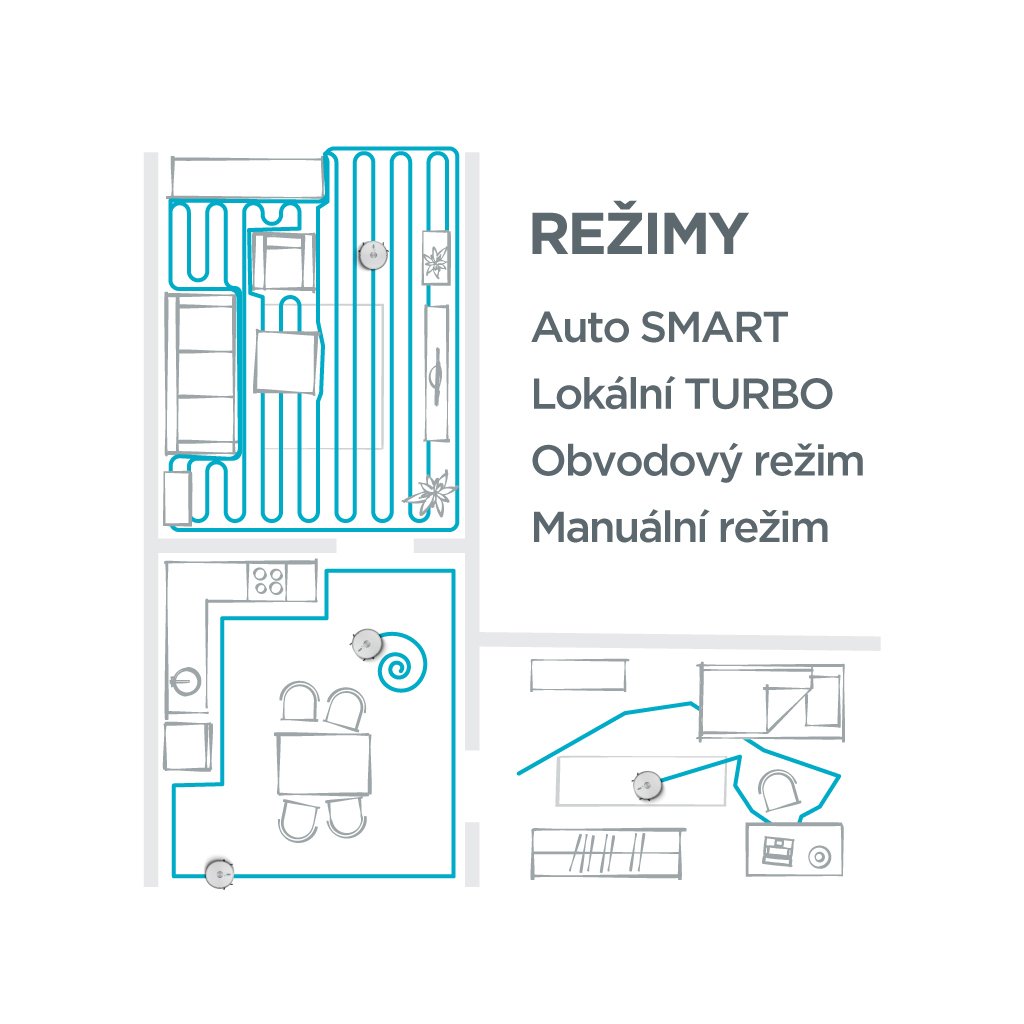 Robot nabízí 4 režimy úklidu. V režimu Auto SMART se vysavač efektivně a systematicky pohybuje v liniích po celém prostoru a na závěr provede úklid podél stěn. V lokálním TURBO režimu se pohybuje ve spirále a vysává na maximální výkon v konkrétním místě. S obvodovým režimem docílíte perfektního úklidu podél stěn. Pomocí manuálního režimu můžete vysavač navést přesně tam, kde zrovna potřebujete uklidit.