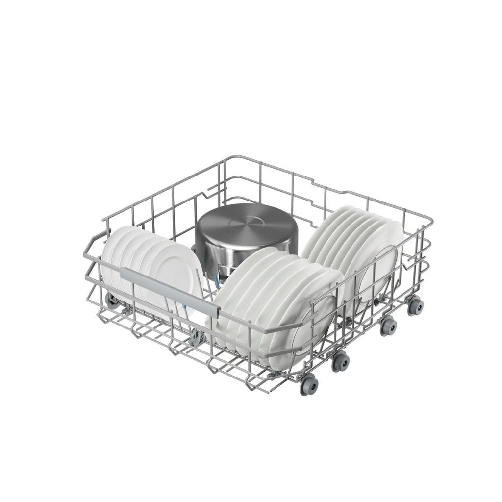 Koše FlexiMax Plus s hladkým pojezdem mají tři sklopné řady pro flexibilní umístění nádobí. Protiskluzové gumové úchyty a hroty udržují nádobí a sklenice na místě a zabraňují jejich narážení. Koš na příbory má hlubší prostřední sekci na kuchyňské náčiní.