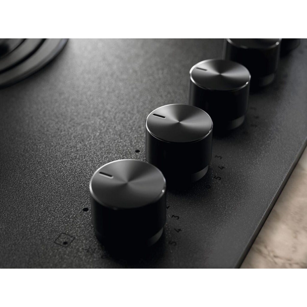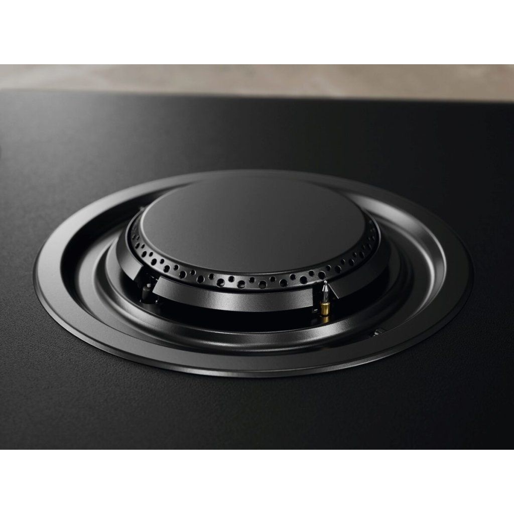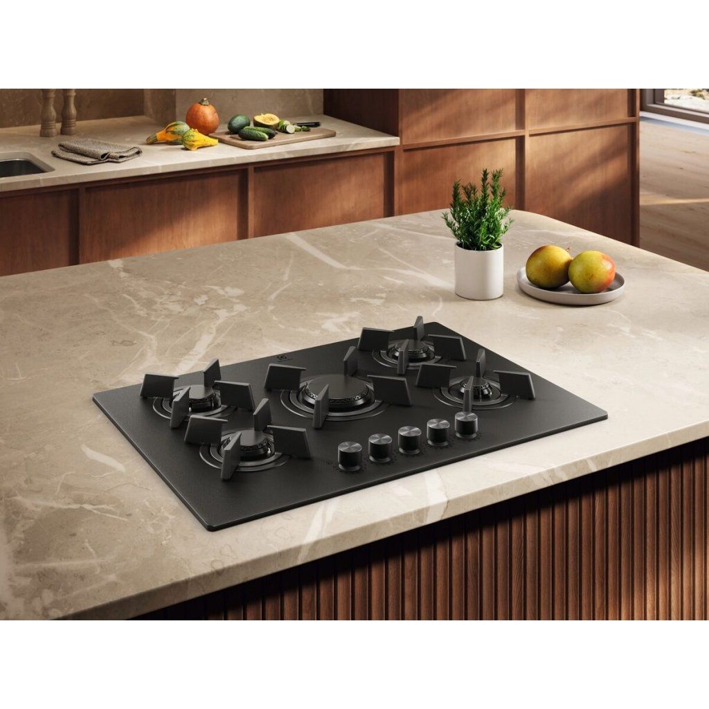 Tato plynová varná deska s matně černým povrchem je vyrobená z temperovaného skla, na kterém neulpívají otisky prstů a které se snadno čistí, aby bylo stále krásné. V kombinaci s dokonale sladěným odsavačem par dotváří moderní dojem z kuchyňské sestavy.