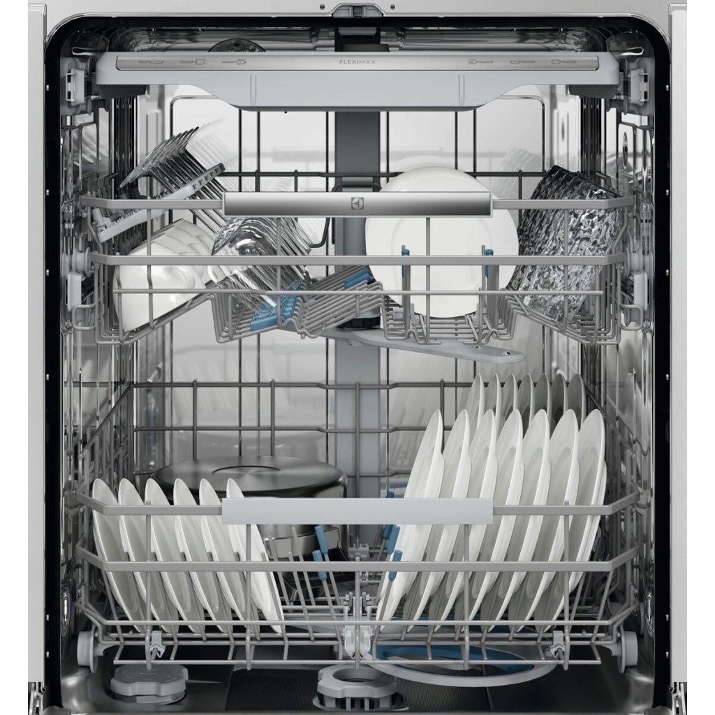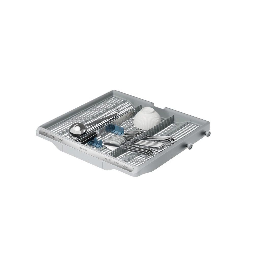 Koše FlexiMax Plus s hladkým pojezdem mají tři sklopné řady pro flexibilní umístění nádobí. Protiskluzové gumové úchyty a hroty udržují nádobí a sklenice na místě a zabraňují jejich narážení. Koš na příbory má hlubší prostřední sekci na kuchyňské náčiní.