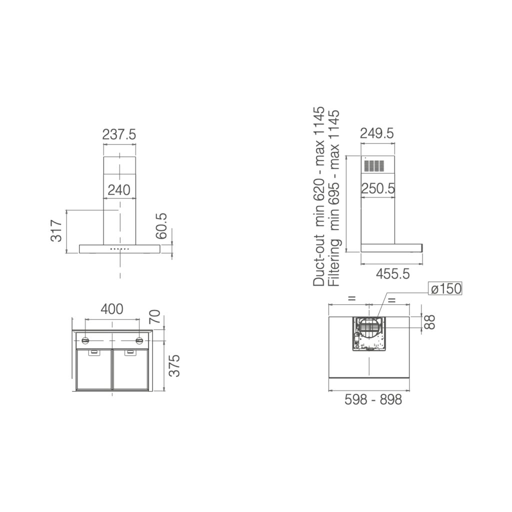 Komínový odsavač par, Barva: Hnědá, Energetická třída: A+, Šířka: 90 cm , Výkon odsávání: 696 m3/h, Průměr odtahu: 150 mm, Směr odtahu: Horní, Možnost recirkulace i odtahu ven