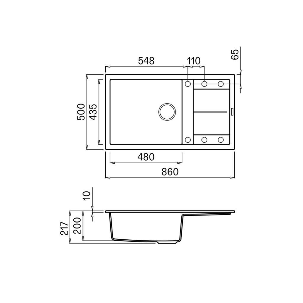 Integrovaná oblast pro příslušenství v odkapávači, vybavená předvrtanými otvory, které vám umožňují instalovat doplňky: excentrické ovládání odpadu, dřezovou baterii s vytahovací sprchou a dávkovač saponátu.
