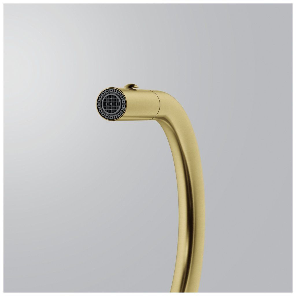 Otočná 360°. S vytahovací koncovkou osazenou perlátorem. S regulací Sprcha/Proud. Opletená sprchová hadice 150 cm. Připojení Hadičky 45 cm. Průtok vody 7,55 l/min. (3 bar). Laminární průtok vody. PVD coating. Není vhodná pro montáž do nerezových dřezů.Doplňkové parametry