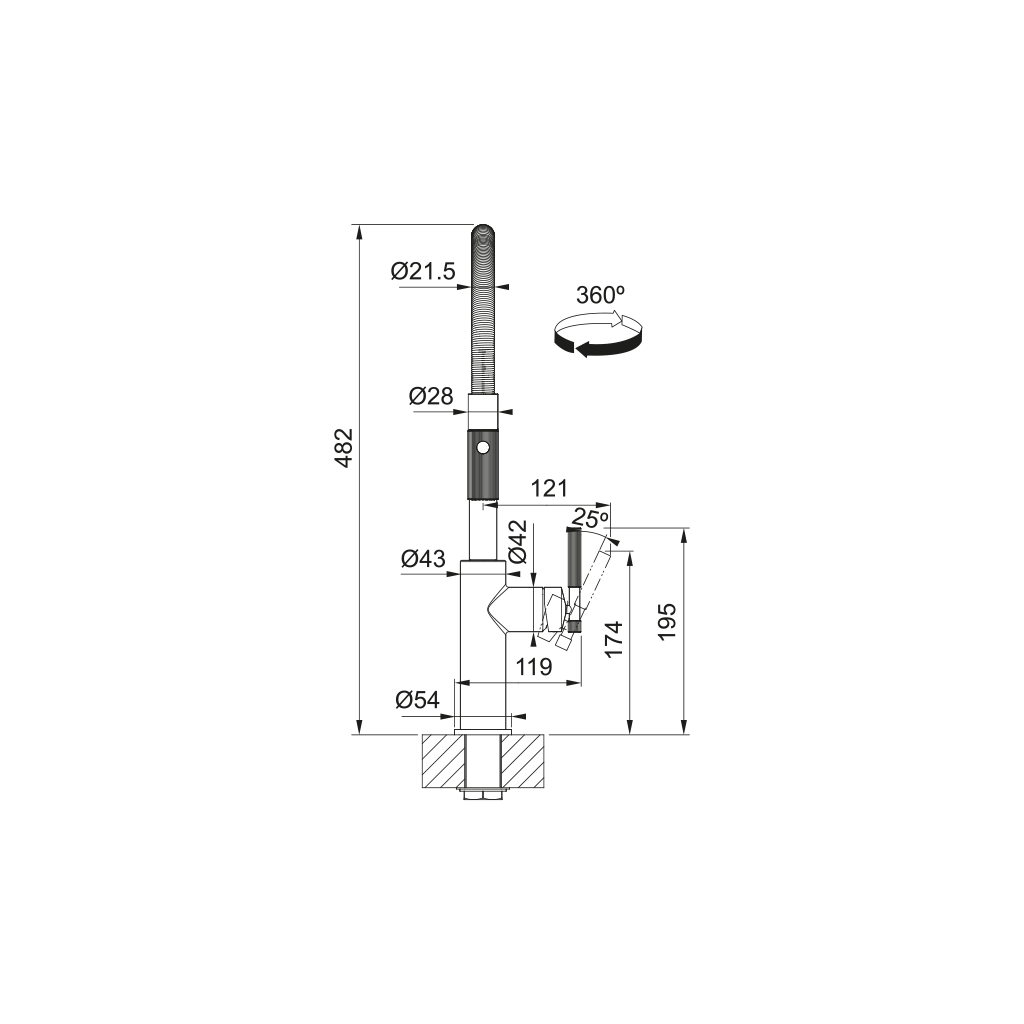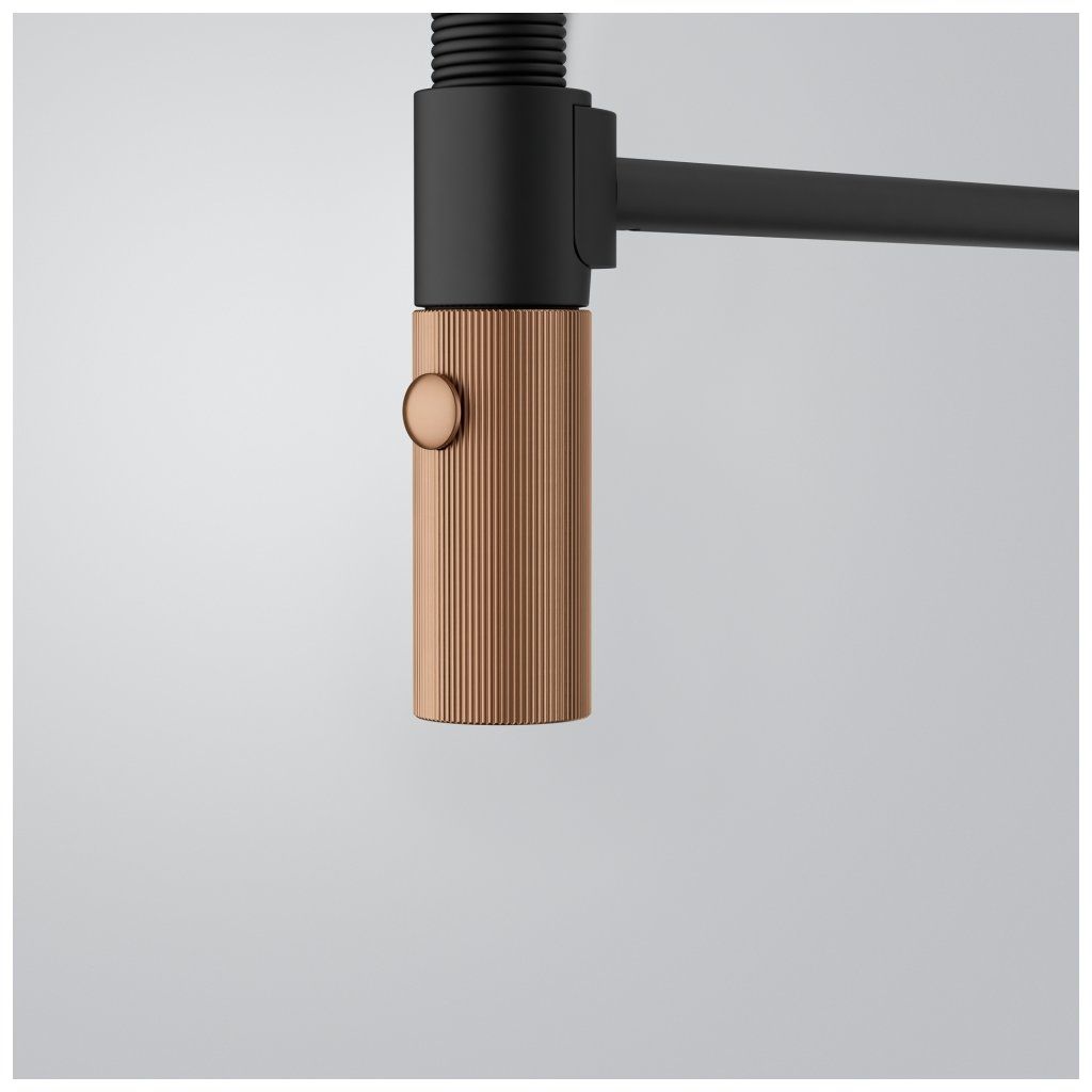 Otočná 360°. S koncovkou na pružině osazenou perlátorem. S regulací Sprcha/Proud. Hadice s kovovou pružinou. Připojení Hadičky 45 cm. Průtok vody 8,65 l/min. (3 bar). Laminární průtok vody. Technologie pro úsporu vody. Koncovka a ovládací páčka v provedení PVD coating.Doplňkové parametry