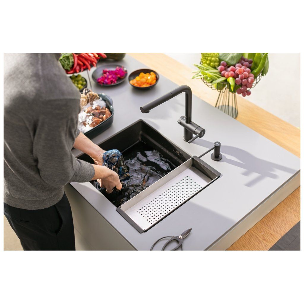 Fragranitový dřez Kubus 2. Cena zahrnuje: Sítkový ventil 3 1/2" s přepadem a nerezovou krytkou ventilu. Sifon pro úsporu místa 6/4 “ s odbočkou na myčku nádobí. V ceně dřezu doplňky: miska, přípravná deska a rolovací rošt.Doplňkové parametry