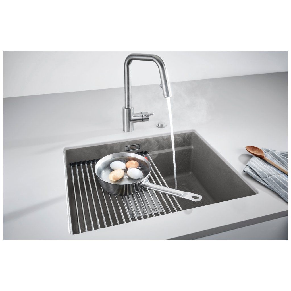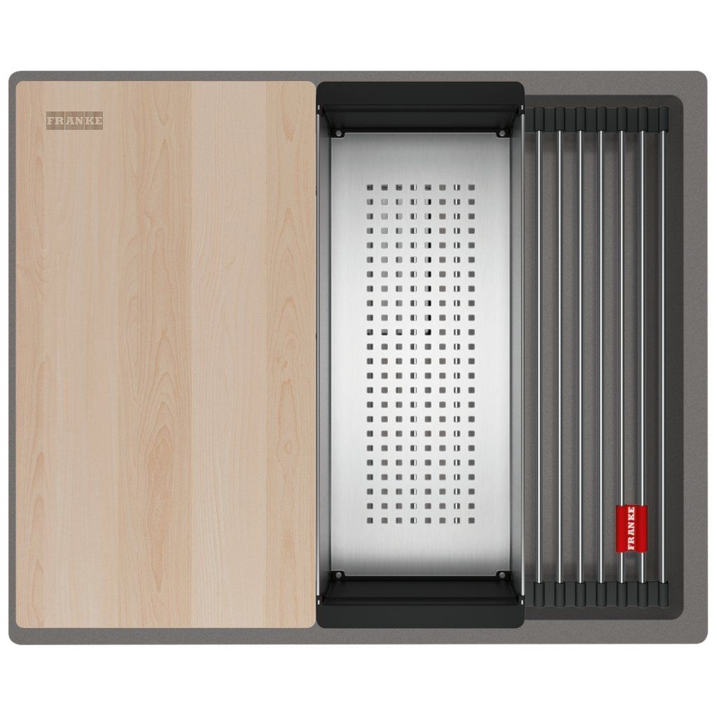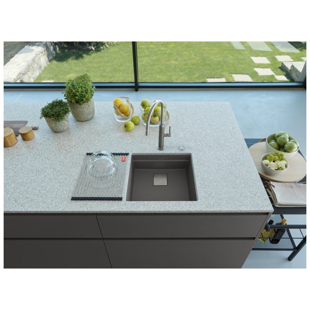 Fragranitový dřez Kubus 2. Cena zahrnuje: Sítkový ventil 3 1/2" s přepadem a nerezovou krytkou ventilu. Sifon pro úsporu místa 6/4 “ s odbočkou na myčku nádobí. V ceně dřezu doplňky: miska, přípravná deska a rolovací rošt.Doplňkové parametry