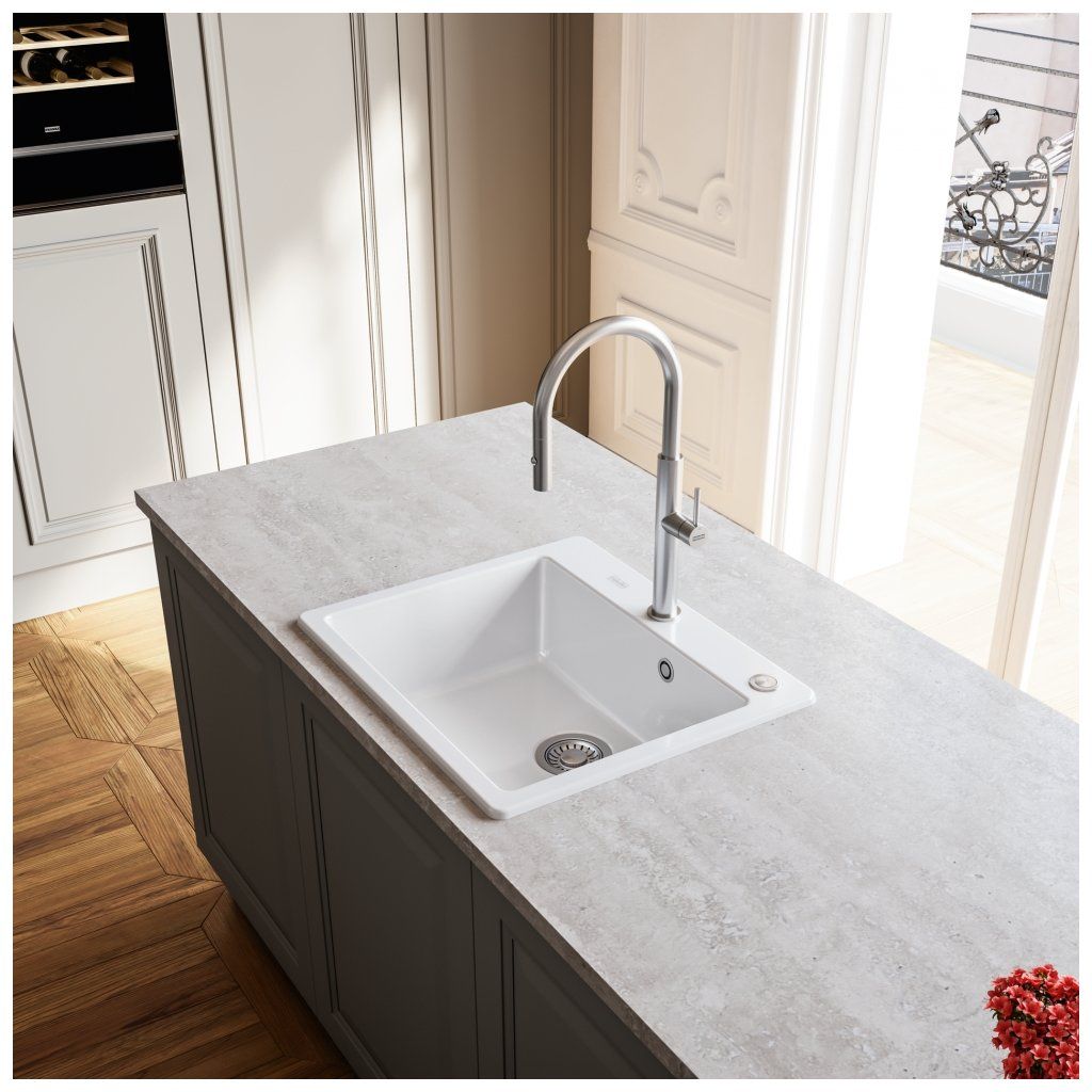 Keramický dřez Mythos. Cena zahrnuje: Easy Click sítkový ventil 3 1/2“ s přepadem. Otvor pro baterii ∅ 35 mm a pro Easy Click knoflík ∅ 35 mm. Dřez je bez sifonu. V důsledku výrobního procesu mají rozměry keramických dřezů větší toleranci a mohou se lišit od rozměrů uvedených v technických výkresech +/- 1%.Doplňkové parametry