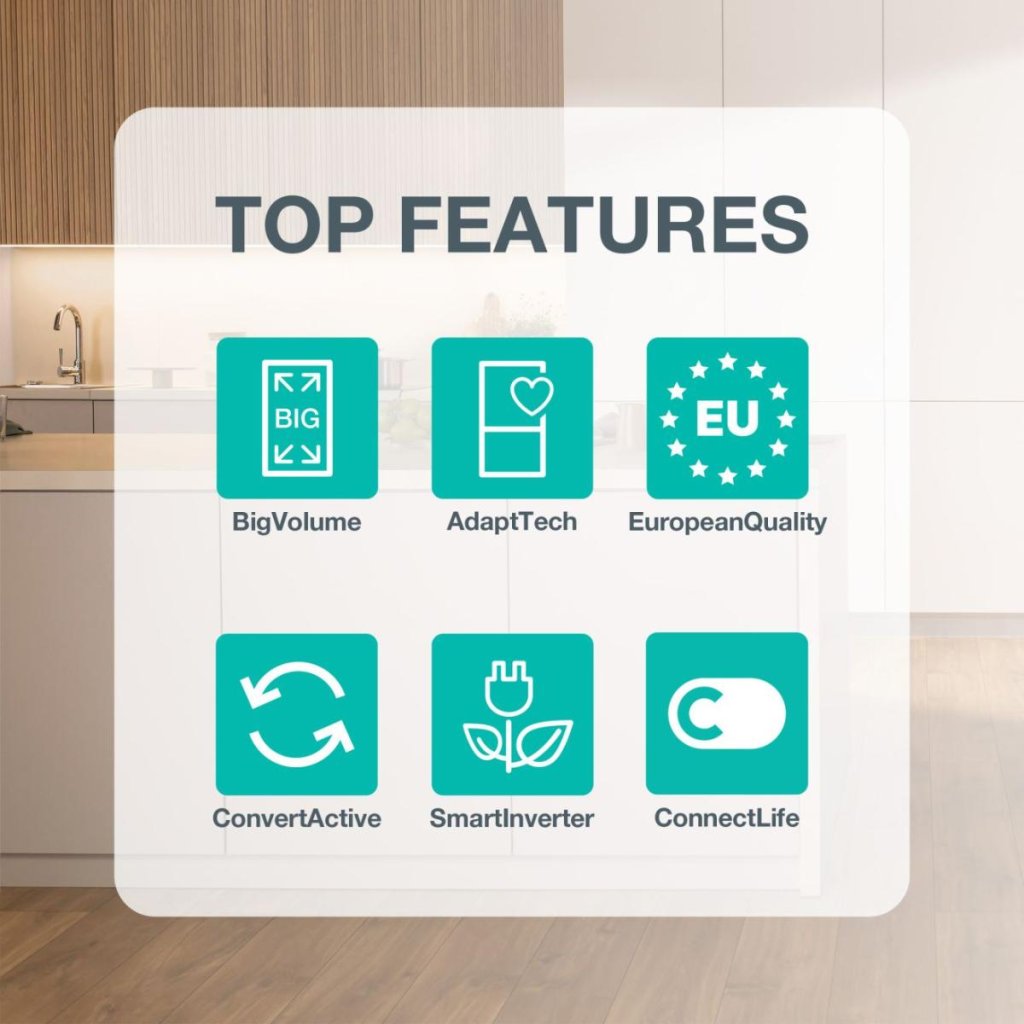 Potřebujete mrazit nebo raději chladit? Díky funkci ConvertTotal můžete snadno změnit teplotu v rozsahu od -24 °C do +8 °C a proměnit mrazák na chladničku. Získáte tak svobodu přizpůsobit úložný prostor podle aktuálních potřeb a vždy mít dostatek místa na čerstvé i zmrazené potraviny.