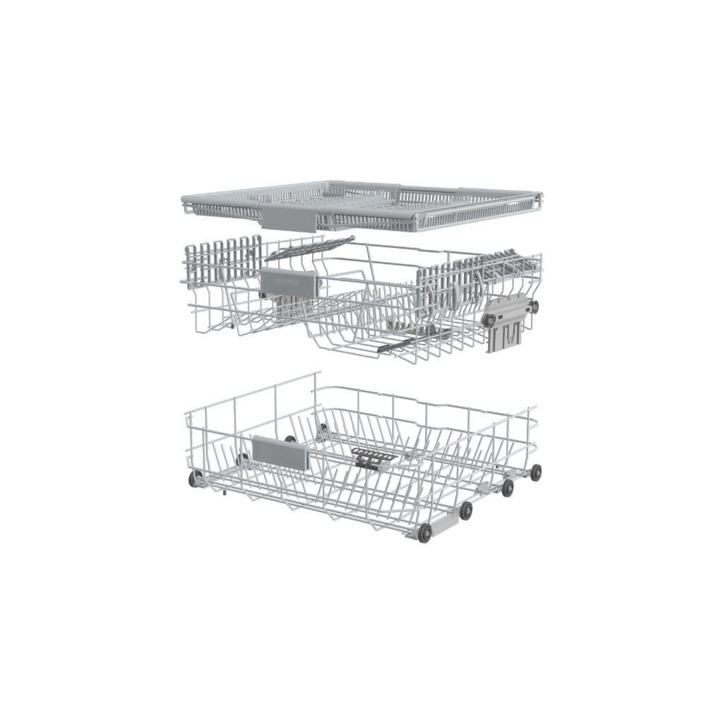| Spodní koš: | Široká mřížka koše Sklopné/dělitelné zadní držáky talířů Koš na příbory |