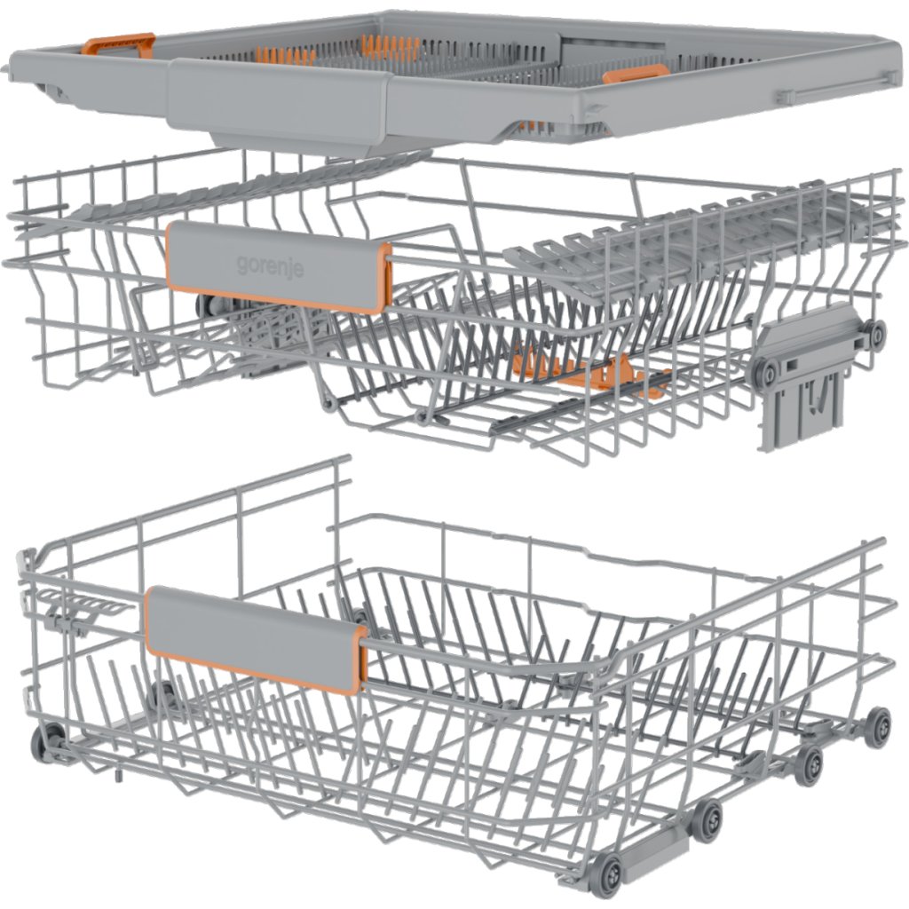 Koše jsou vybaveny zvýrazněnými pohyblivými prvky a přizpůsobitelným rozložením koše pro snadné nakládání. Opravdu jednoduchý dvouúrovňový systém nastavení koše vám umožní umístit i ty největší hrnce a talíře. Stojan na talíře ve spodním koši lze snadno složit. Příbory lze perfektně organizovat na speciálním tácu, kde jsou umístěny odděleně pro dokonalé výsledky mytí a sušení. Každý detail je pečlivě navržen pro co nejjednodušší manipulaci.