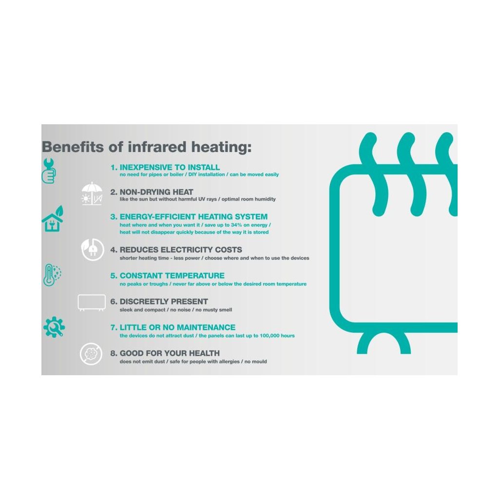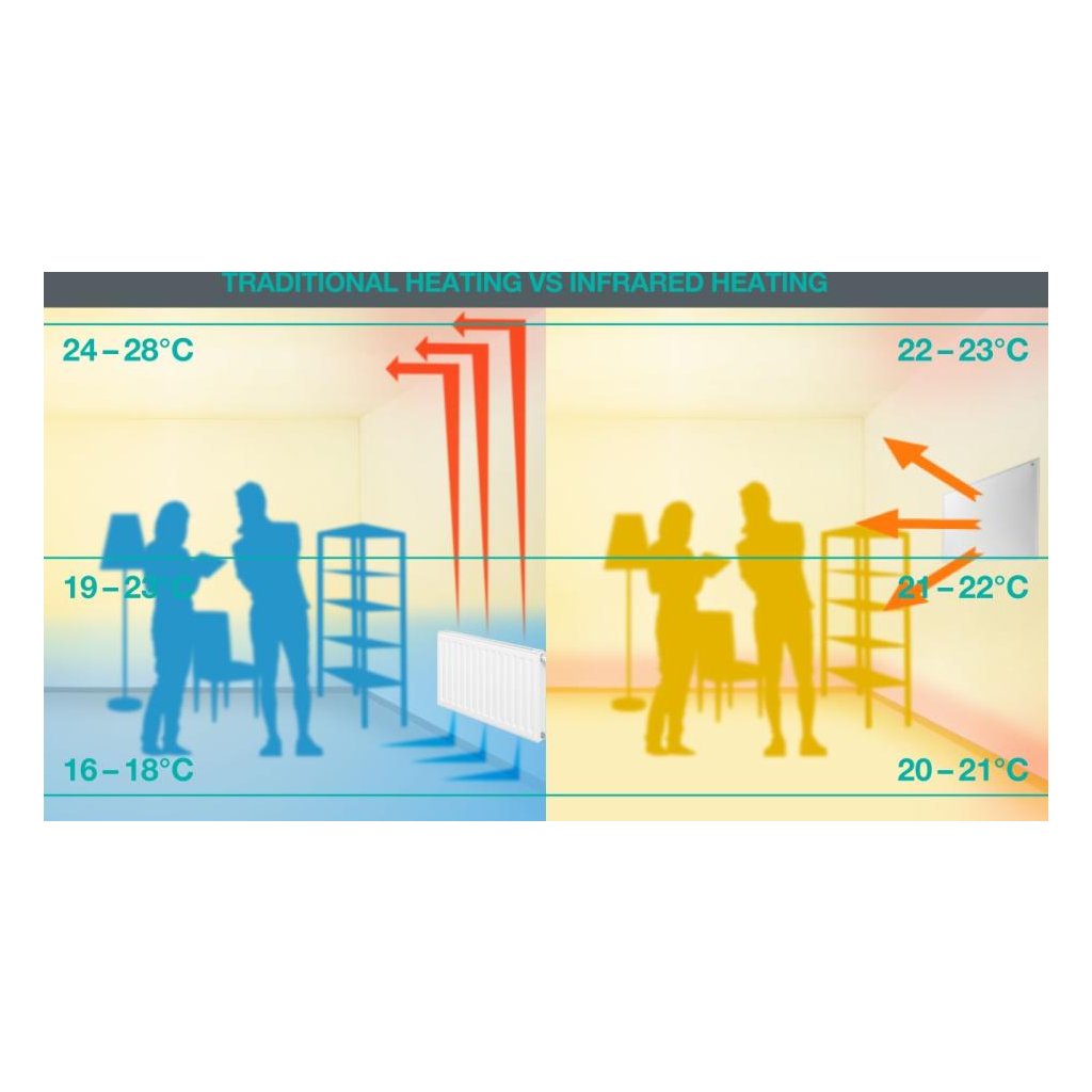 Infrared heating works by heating the surface area of a room, rather than a volume. It uses Hi-Tech carbon crystal heating element. You will get this feeling of deep heat as you do when enjoying in the sun.