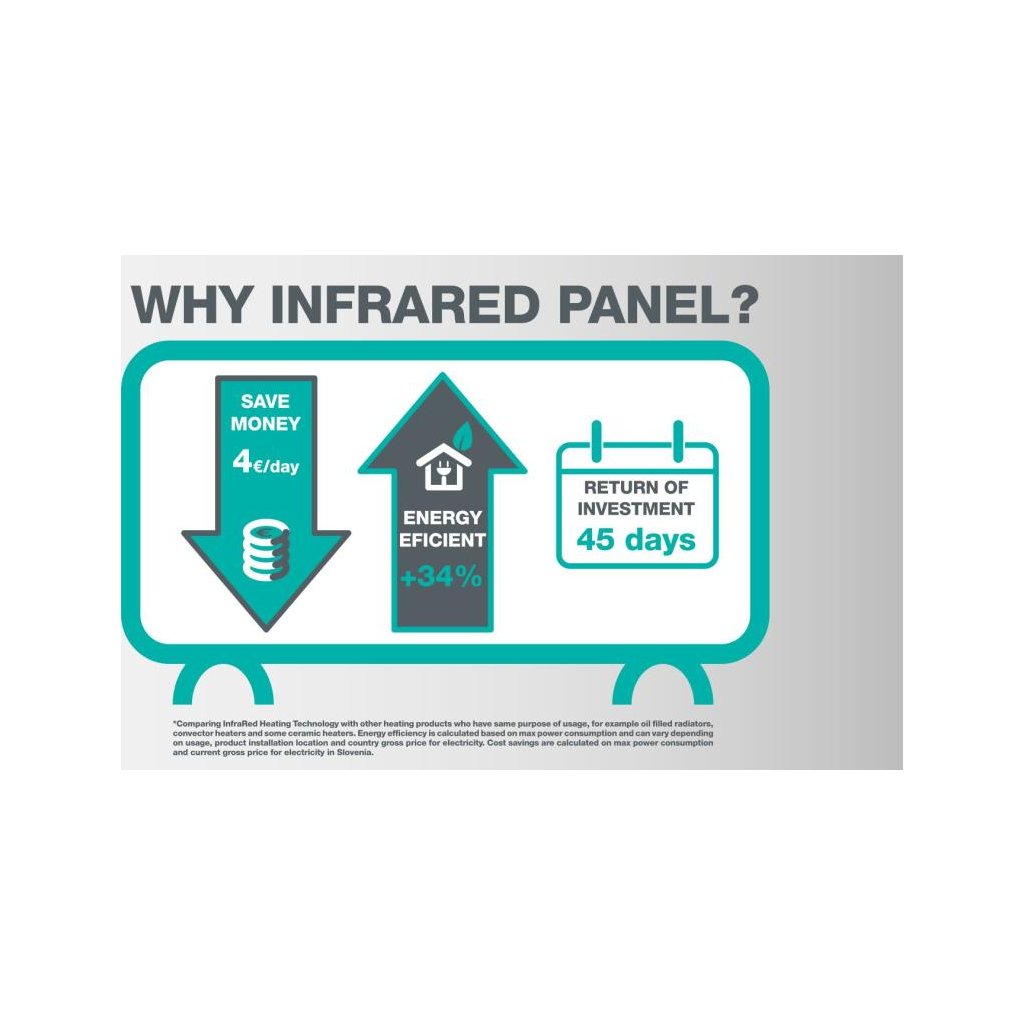 Infrared panel from Gorenje is sleek and compact, with an elegant silver frame and it will fit to any room. Even to a children room because it is completely silent, and do not attract or emit dust and musty smell.