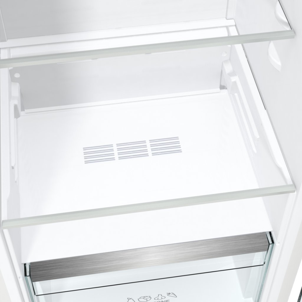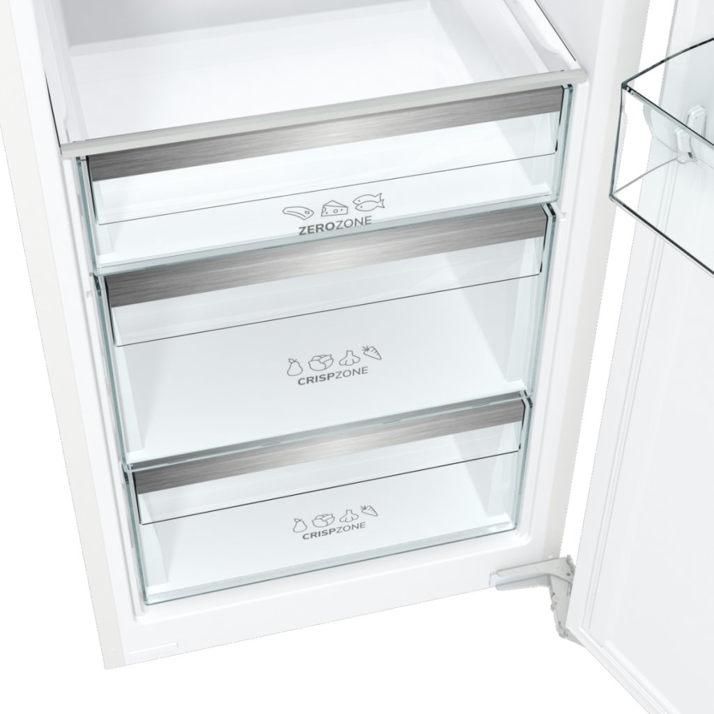 Prostorná zásuvka CrispZone je navržena tak, aby uchovala více živin a prodloužila čerstvost ovoce a zeleniny. Nízká teplota v kombinaci s automatickou regulací vlhkosti SmartHumidity vytváří ideální podmínky pro skladování. Speciální membrána odvádí přebytečnou vlhkost, takže ovoce a zelenina zůstávají křupavé a svěží. Teleskopické lišty usnadňují otevírání zásuvky i přístup k jejímu obsahu.