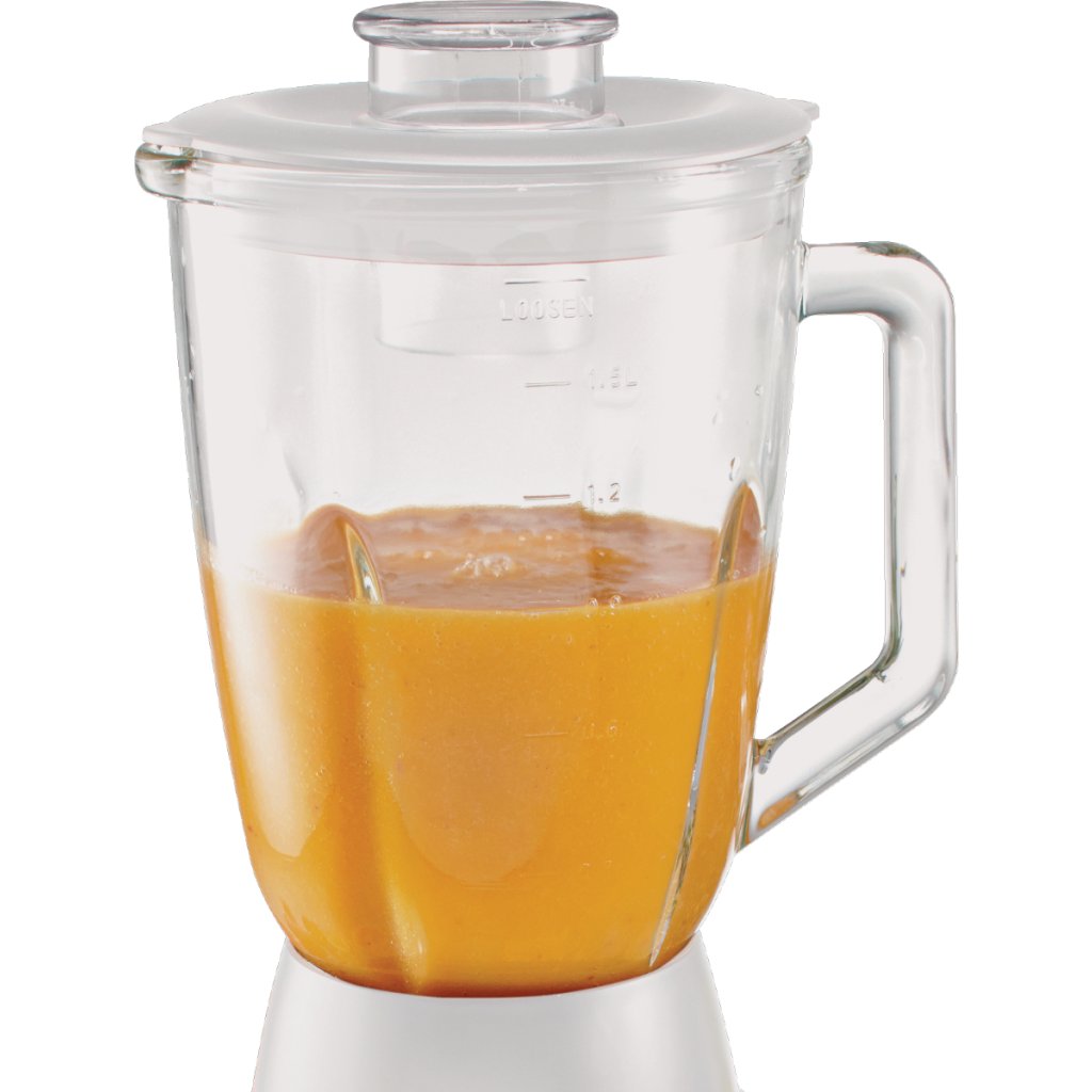 1,5 L jar comes equiped with measurement markings and a dosing cup at the top of the lid. There is no need to remove the lid when adding ingredients.