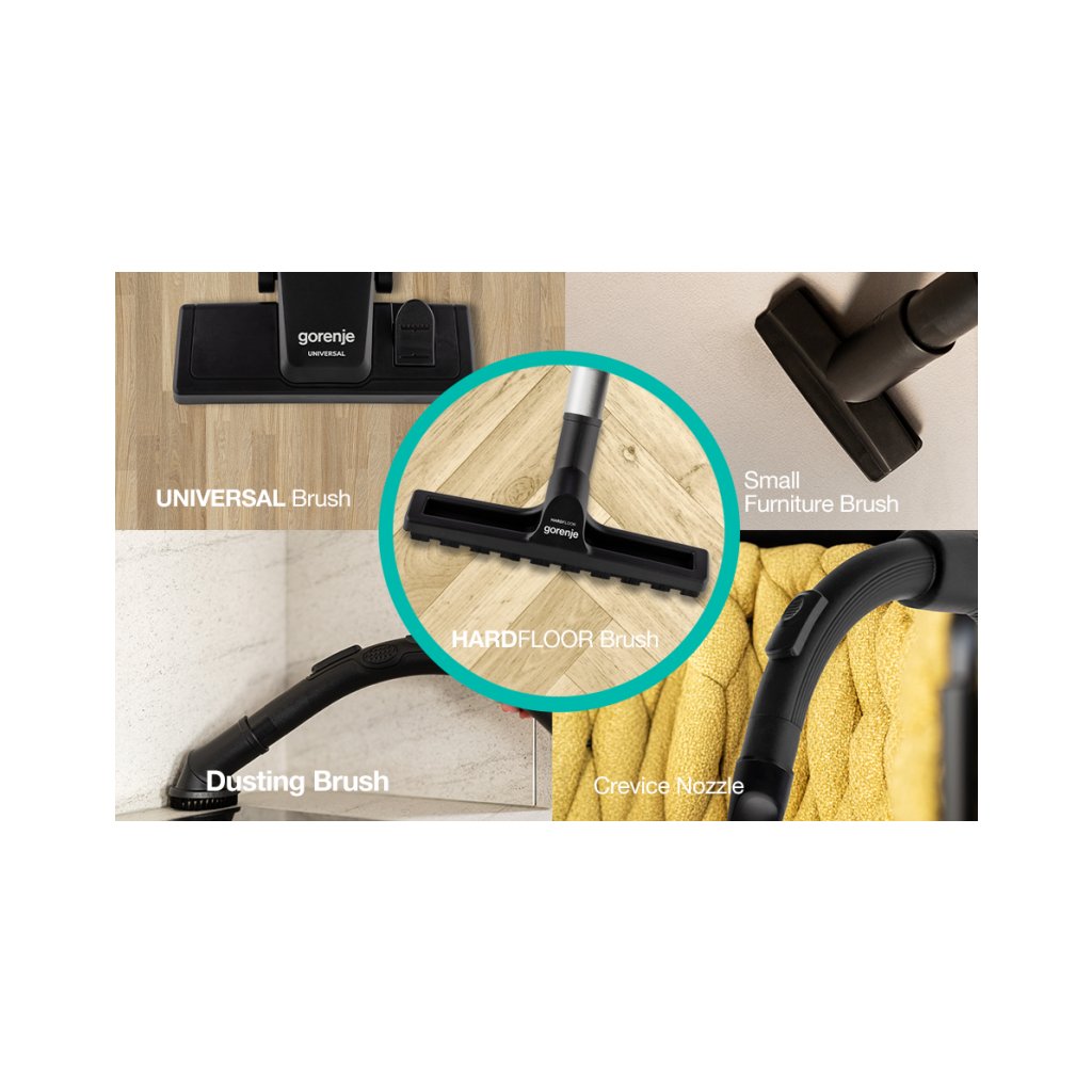 | Dodatečná výbava: | Hardfloor brush Kartáčová tryska Štěrbinová tryska Small furniture nozzle |