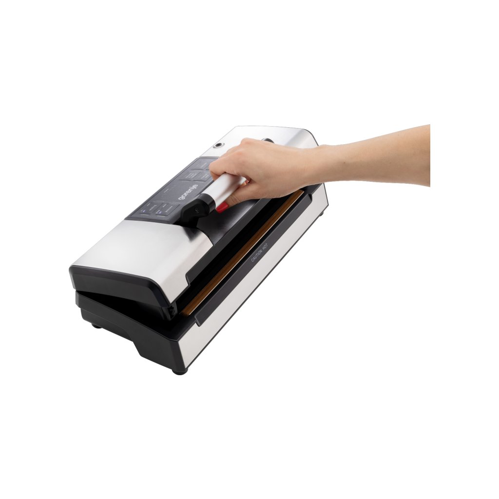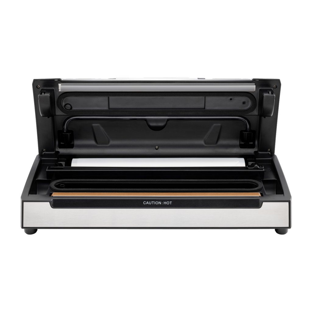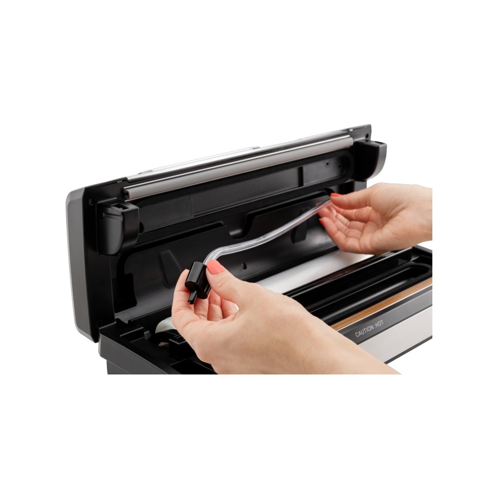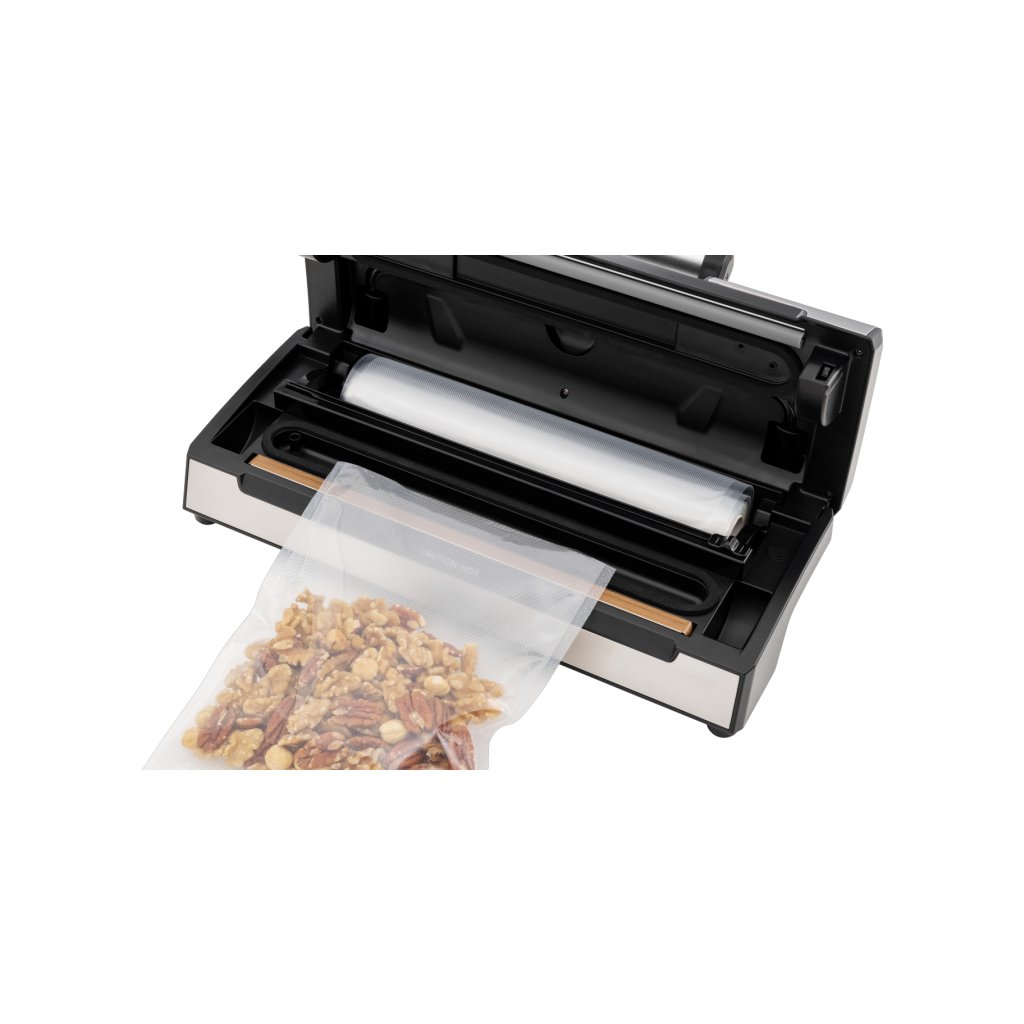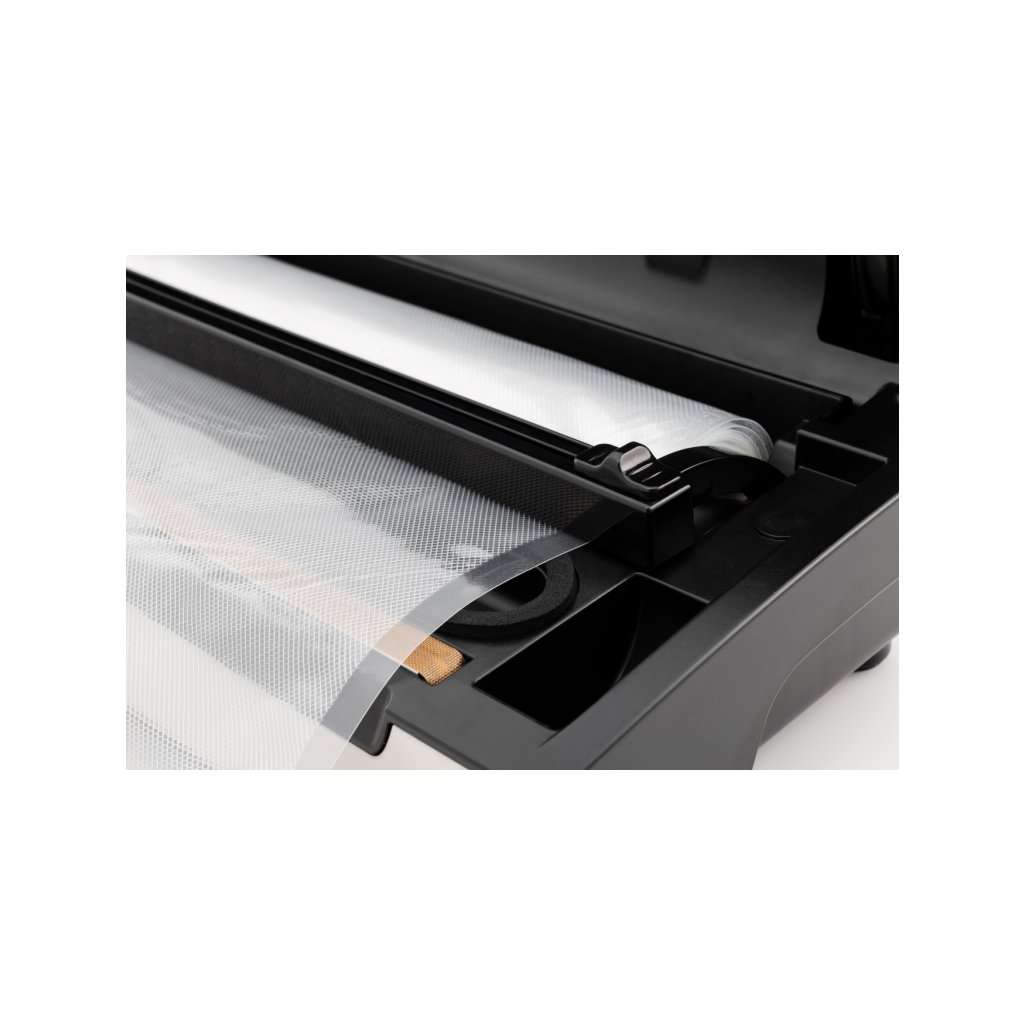 With a built-in bag cutter, cutting bags to the perfect size is effortless. The integrated storage space for rolls ensures everything you need is right at hand, while the simple lock system with an easy-to-use handle makes sealing quick and secure. It features a clever cord storage system at the bottom, keeping your kitchen tidy. Streamline your food preservation process with this thoughtfully designed vacuum sealer.
