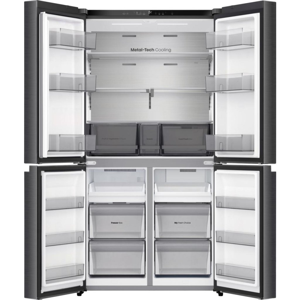 Čtyřdveřová chladnička s mrazákem vám poskytne dostatek prostoru pro potraviny pro celou rodinu. Díky širokému otevírání dveří máte vždy dokonalý přehled o všem, co je uvnitř.