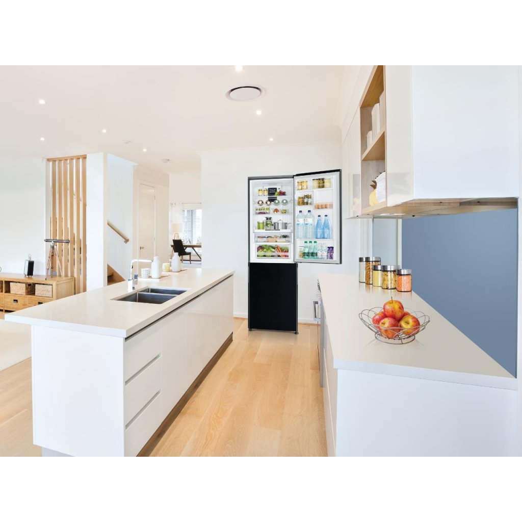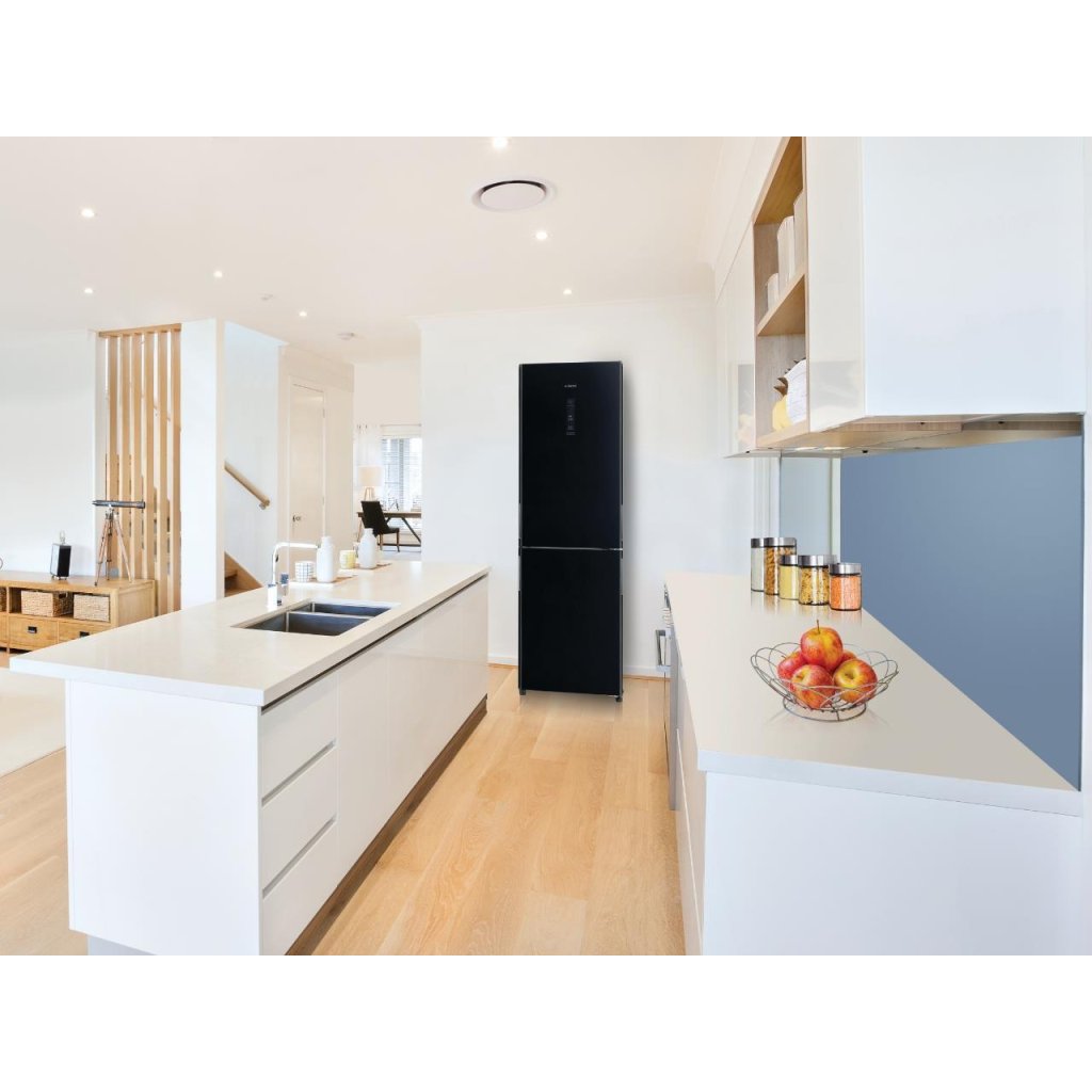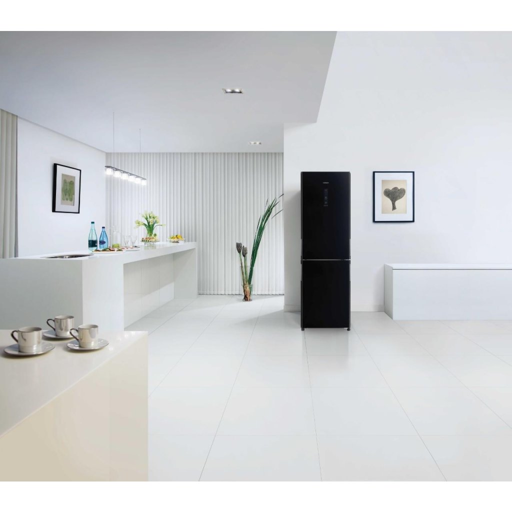 Kombinovaná dvoudveřová chladnička s mrazničkou vespod, provedení GLASS BLACK (černé sklo), Energetická třída E, No Frost, LED osvětlení v chladícím oddíle, police z tvrzeného skla, Inverterový kompresor s technologií Dual Fan pro distribuci chladícího vzduchu v širokém rozsahu výkonů ve všech oddílech chladničky, Zásuvka s volitelným režimem zelenina/maso, Elektronická regulace teploty, Skleněný dotykový ovládací panel, čidlo ETS, titanový nanofiltr proti bakteriím, plísním a zápachu.