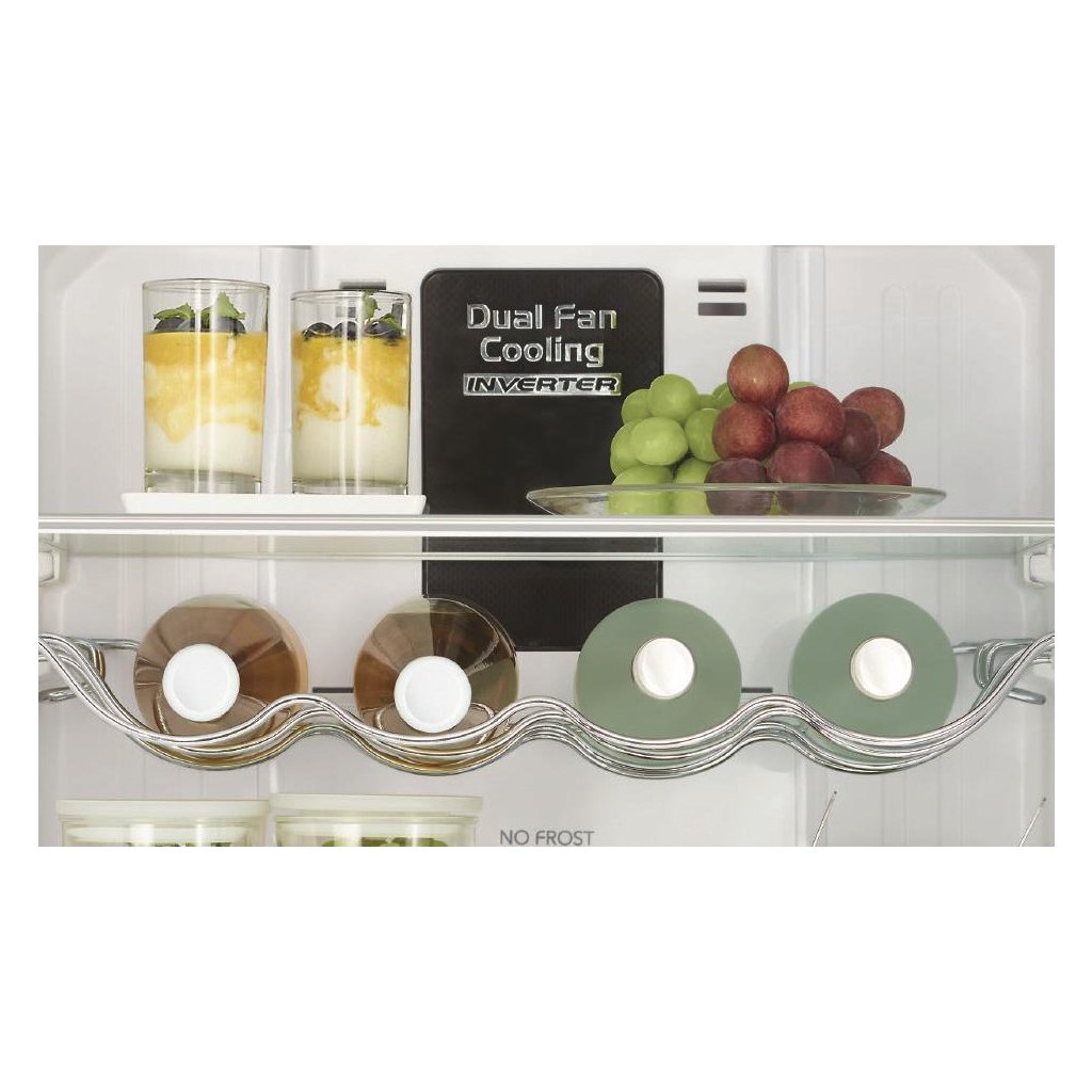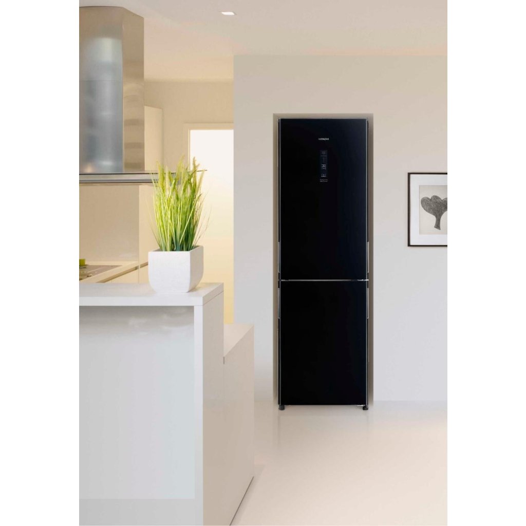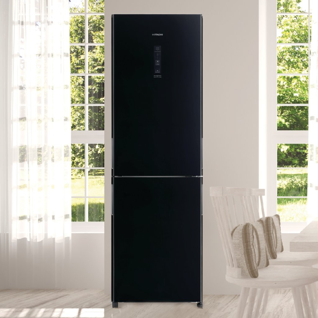 Kombinovaná dvoudveřová chladnička s mrazničkou vespod, provedení GLASS BLACK (černé sklo), Energetická třída E, No Frost, LED osvětlení v chladícím oddíle, police z tvrzeného skla, Inverterový kompresor s technologií Dual Fan pro distribuci chladícího vzduchu v širokém rozsahu výkonů ve všech oddílech chladničky, Zásuvka s volitelným režimem zelenina/maso, Elektronická regulace teploty, Skleněný dotykový ovládací panel, čidlo ETS, titanový nanofiltr proti bakteriím, plísním a zápachu.