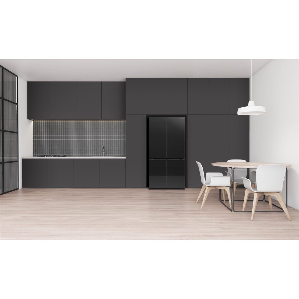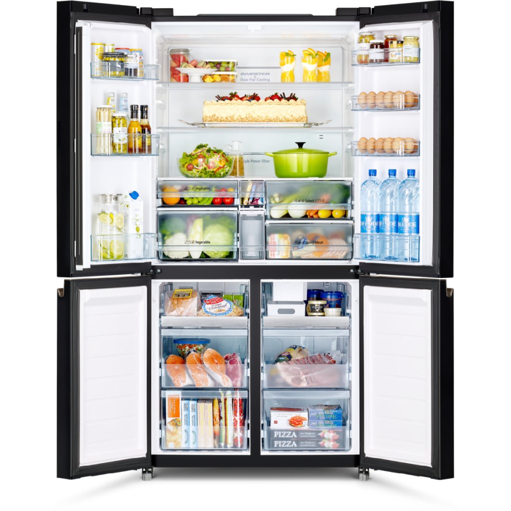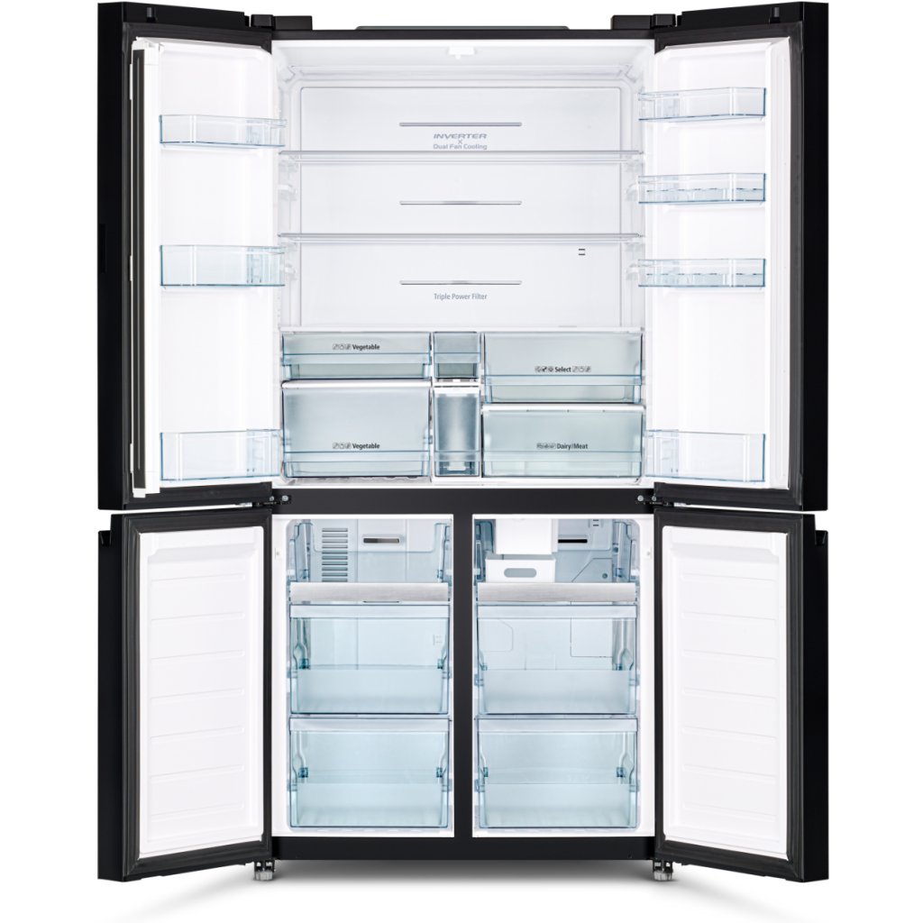 Stylová kombinovaná čtyřdveřová chladnička s chladícím oddílem nahoře a mrazícím oddílem ve spodní části o celkovém čistém objemu 569 l, provedení GLASS CLEAR BLACK (čiré černé sklo), Energetická třída E, No Frost, LED osvětlení, police z tvrzeného skla, Invertorový kompresor s technologií Dual Fan pro distribuci chladícího vzduchu v širokém rozsahu výkonů, VIP - vakuové izolační panely pro maximální úsporu energie, čidlo ETS, Elektronická regulace teploty, účinná eliminace pachů pomocí filtru s trojím účinkem, dotykové ovládání na dveřích, úsporný režim, dveřní alarm. Rozměry (VxŠxH): 184 x 90 x 72 cm, Hmotnost: 110 kg