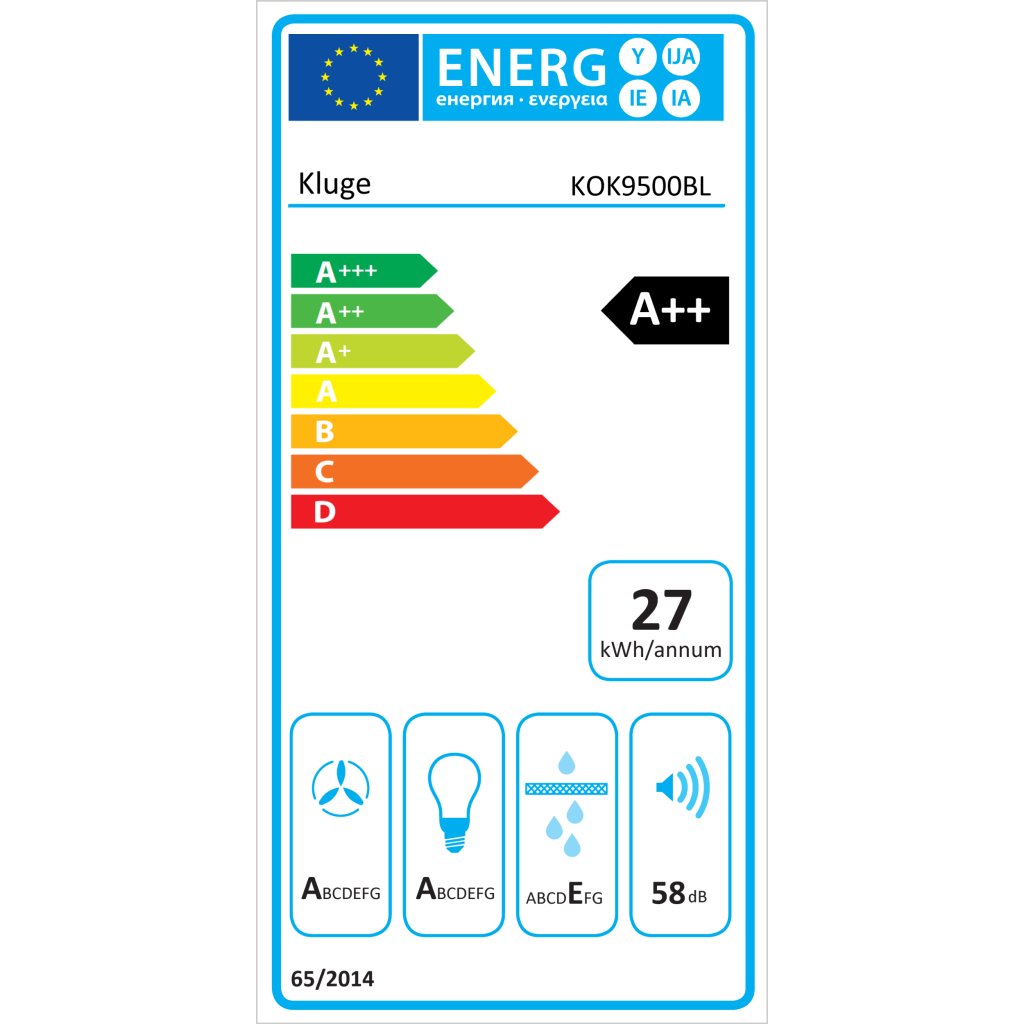 Komínový odsavač par KOK9500BL v elegantním černém matném provedení; Šířka 90 cm, výška panelu 8 cm; Ovládání gesty a dálkovým ovladačem; 3 stupně odsávání + Boost; Funkce HTH – automatické ovládání odsavače z varné desky; Funkce HTH (Hob to Hood) umožňuje propojení odsavače s varnými deskami vybavenými tímto systémem, po spárování odsavač automaticky upravuje výkon odsávání podle intenzity vaření, takže není nutné odsavač ručně nastavovat; Osvětlení 1× LED panel, 9 W s nastavením jasu a teploty světla; Výkon odtahu 185–400 m³/h, 690 m³/h v režimu BOOST; Hlučnost 40–58 dB(A), 68 dB(A) v režimu BOOST; Tukový hliníkový filtr a volitelný uhlíkový filtr pro recirkulaci (uhlíkové filtry FR-8705, 2 ks k dokoupení); Vysoká účinnost filtrace mastnot; Možnost výškového nastavení; Energetická třída A++; Roční spotřeba energie 27 kWh; Rozměry (V׊×H): min. 77,0 – max. 95,5 × 89,9 × 49,8 cm