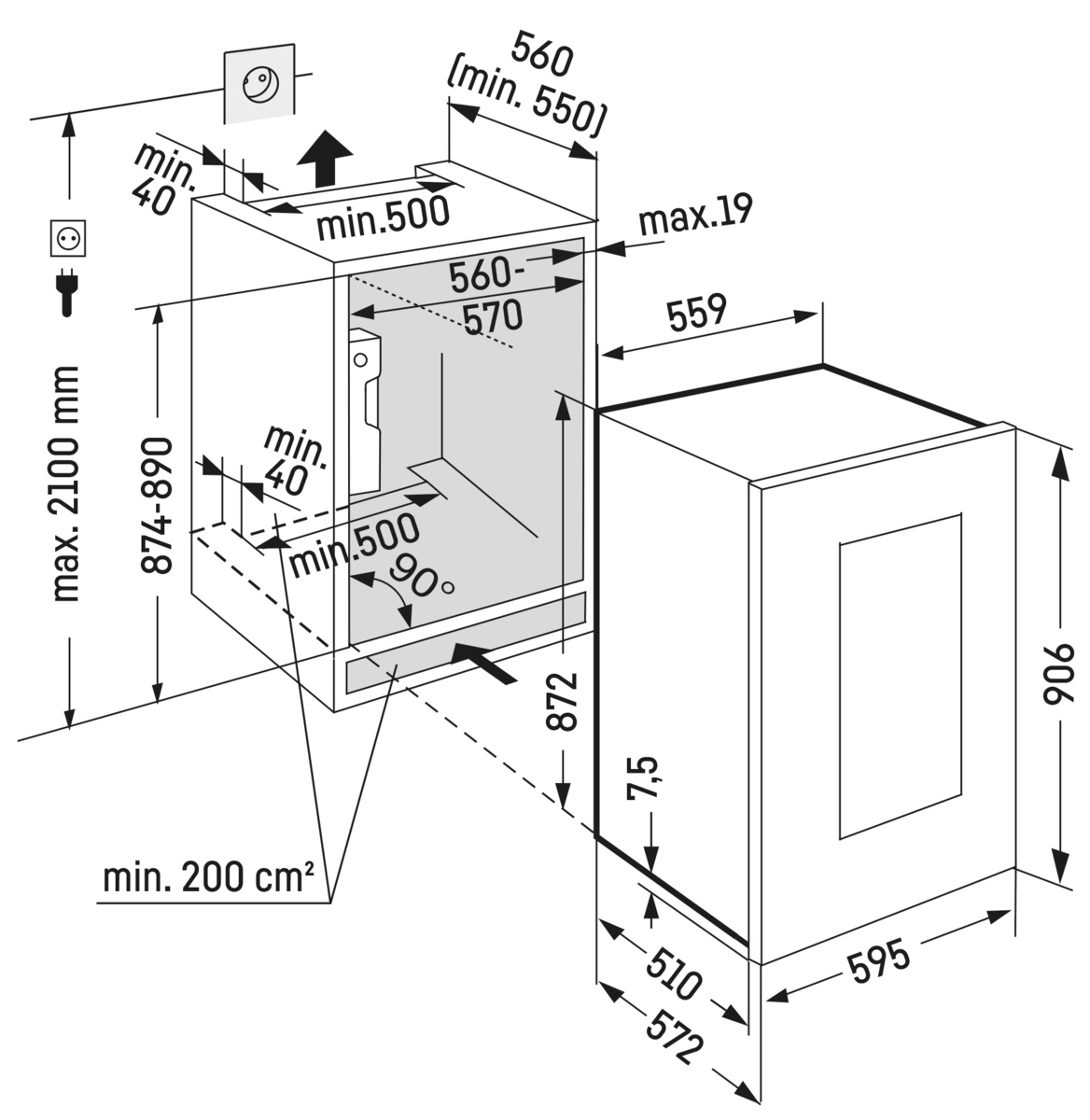 | Prostor pro instalaci (VxŠxH): | 874-890x560-570x550 mm |