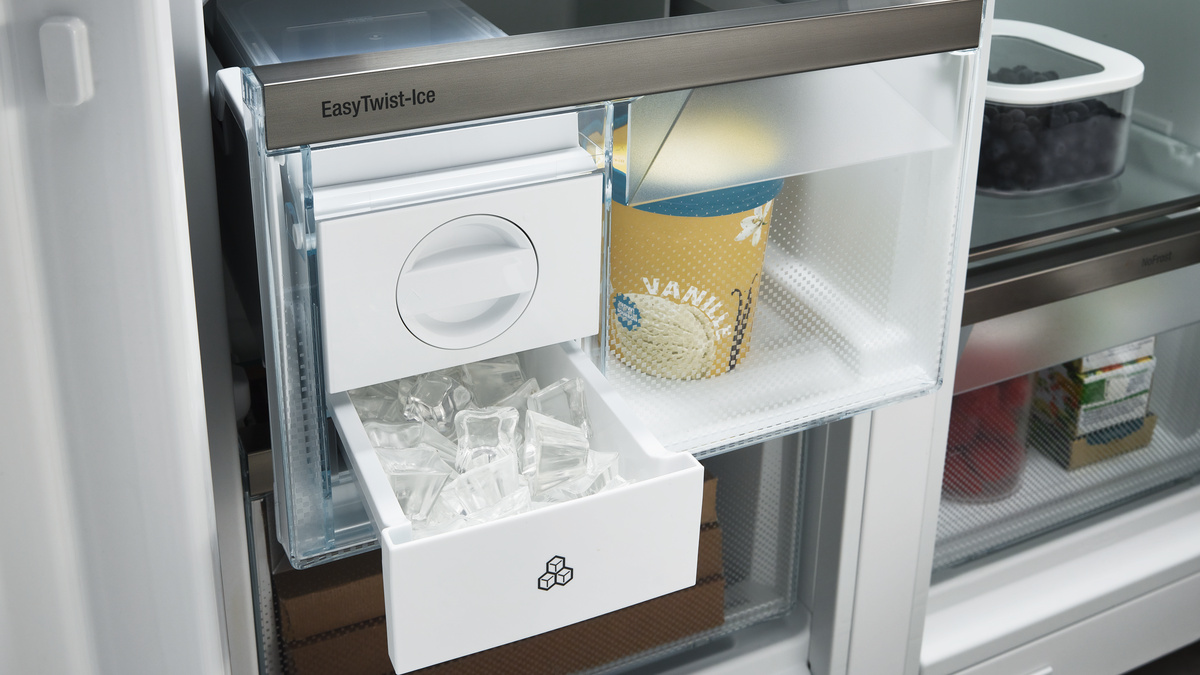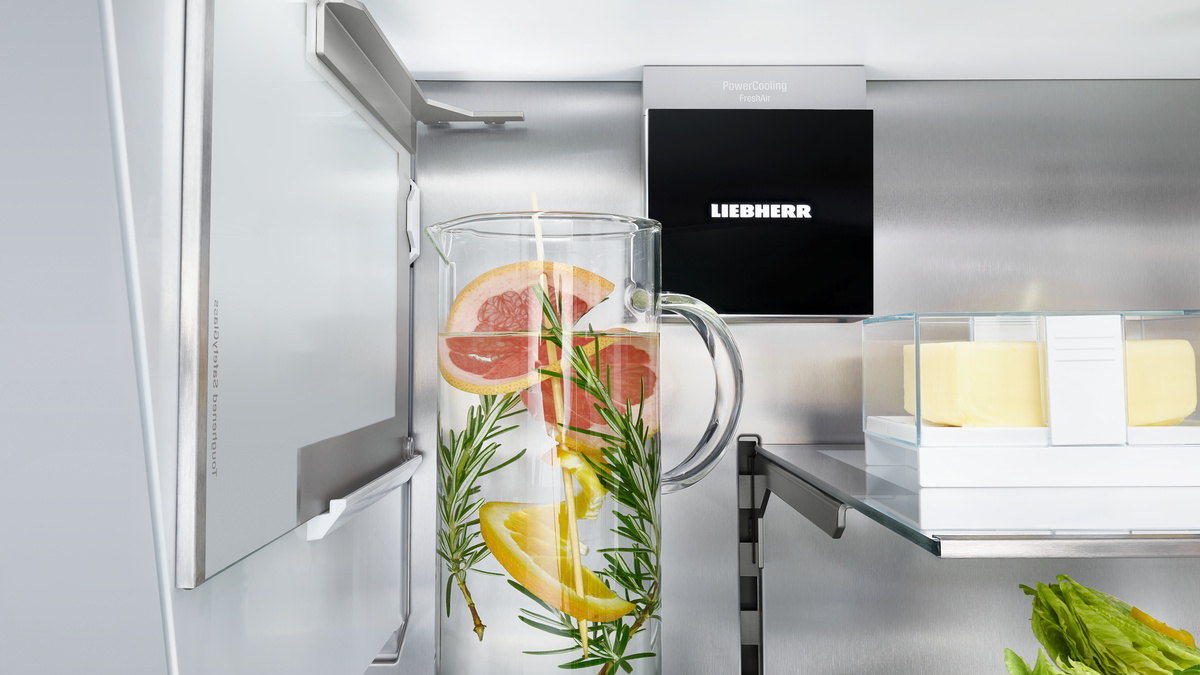 Chcete do chladničky uložit karafu s čerstvou limonádou, ale překáží vám skleněná police? To u spotřebiče Liebherr nehrozí: Stačí nadzvednout čtvrtinu skleněné police. Bezpečně se opře o boční stěnu zásobníku Water & Ice a nabídne vám další praktický prostor pro uložení předmětů, jako jsou karafy nebo vysoké sklenice a láhve.