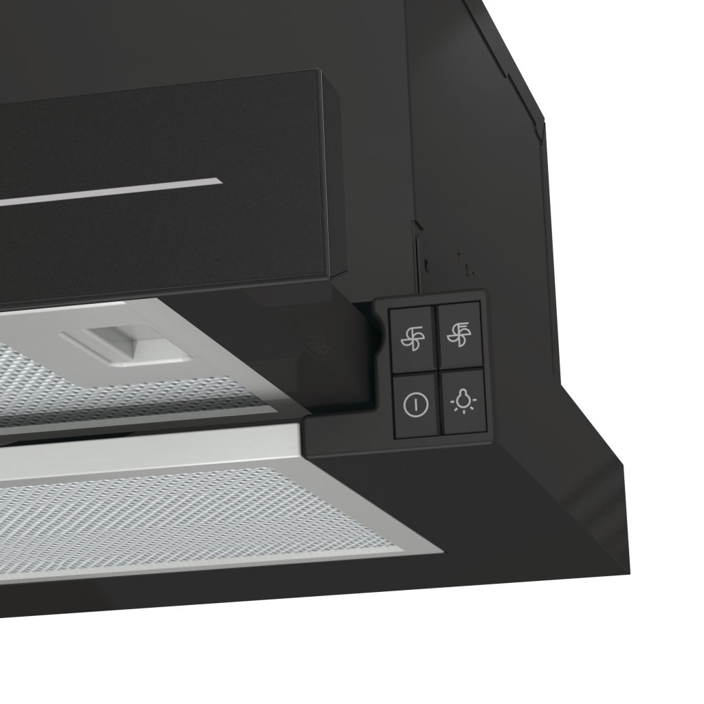 Výsuvný odsavač par, Barva: Černá, Energetická třída: D, Šířka: 60 cm, Výkon odsávání: 304 m3/h, Průměr odtahu: 120 mm, Směr odtahu: Horní, Možnost recirkulace i odtahu ven