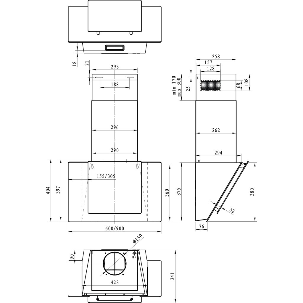 Komínový odsavač par, Barva: Černá, Energetická třída: A++, Šířka: 90 cm, Výkon odsávání: 789 m3/h, Průměr odtahu: 150 mm, Směr odtahu: Horní, Možnost recirkulace i odtahu ven