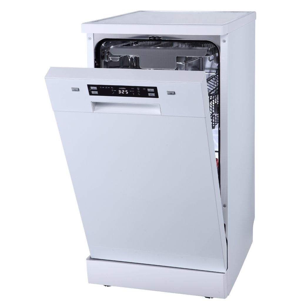 volně stojící myčka Mora SM 526C3 W je díky šířce pouhých 45 cm vhodná i do menších kuchyní, kde je třeba hospodařit s každým centimetrem. I přes svou menší šířku má však až 3 úložné koše a poradí si s 10 sadami nádobí. Nádobí dokonale umyje díky třem ostřikovacím ramenům a pěti výškovým úrovním proudu vody, takže bude bezvadně čisté, i když bude myčka opravdu plná a nádobí bude hustě naskládané. Horní koš slouží pro pečlivé a šetrné mytí příborů a kuchyňského náčiní. Skrytý ovládací panel je opatřen tlačítkovým ovládáním, displejem a praktickými funkcemi, jako je například SušeníPlus, která po ukončení programu automaticky pootevře dvířka, aby tak unikla pára a následný sušicí cyklus byl efektivnější a energeticky úsporný. Samozřejmostí je úsporný ECO program, program pro sklo nebo AUTO program, který sám zvolí optimální parametry mytí. Praktický je i odložený start až o 24 hodin. Myčka má navíc šikovný samočistící filtr, a tak automaticky odstraní zbytky mastnoty a jídla ve filtru a zamezí nesprávnému chodu spotřebiče. Se systémem AquaStop se nemusíte obávat nemilého překvapení v podobě vytopení.