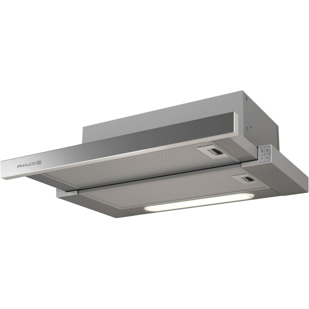 Výsuvný odsavač par Philco Apia 60 LC disponuje třemi rychlostmi s maximálním výkonem 320 m³ za hodinu. Pracovní plochu je možné osvětlit zabudovanými LED osvětlením.