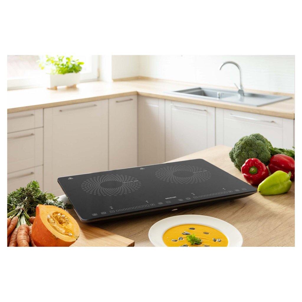 Vařič SCP 4501BK s dvojicí indukčních zón, dotykovým ovládacím panelem (včetně slideru), vestavěným časovačem, protiskluzovými nožkami a napájecím kabelem.