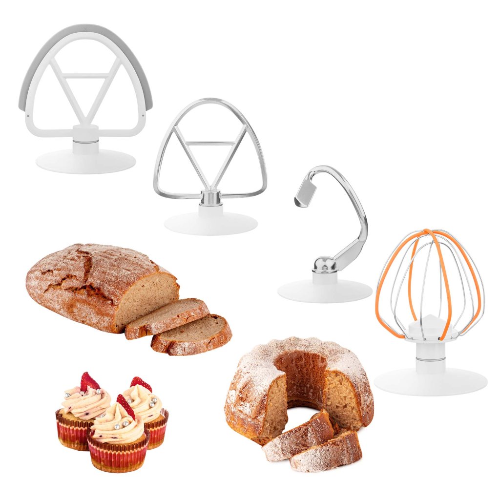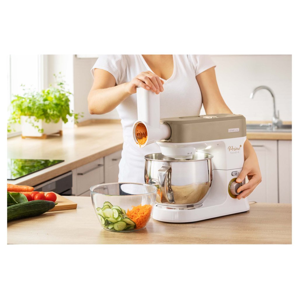 Robot rozšíří vaše možnosti i mimo pečení: tři nástavce na těstoviny (např. špagety, tagliatelle, penne), tvořítko na cukroví pro kreativní tvary a kráječ/struhadlo se čtyřmi výměnnými nástavci pro plátkování a jemné i hrubé strouhání.
