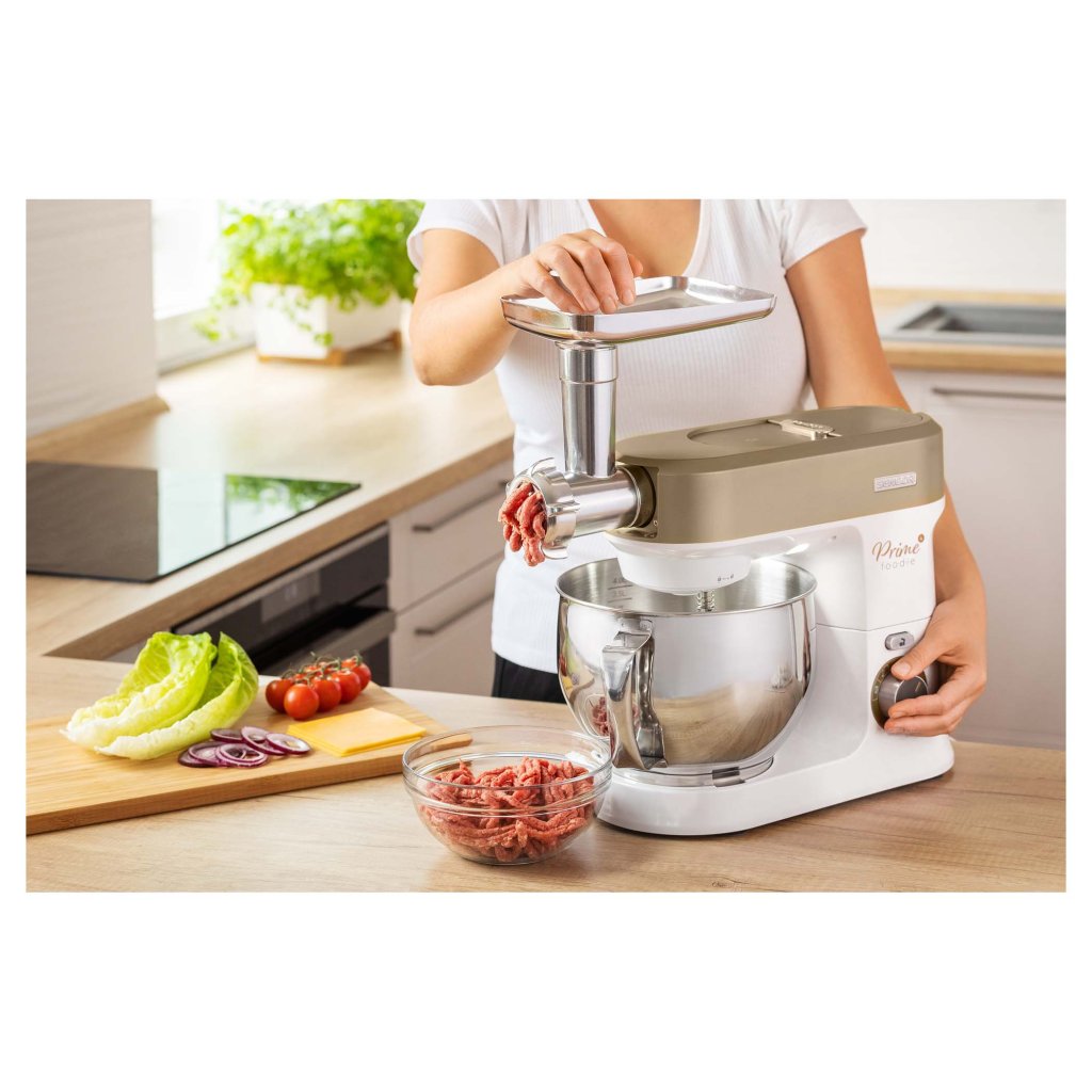 - Příslušenství: balónová metla, míchací metla, FLEXI šlehač s metlou, hnětací hák, mlýnek na maso (disky jemný/střední/hrubý, plnění střívek), 3× těstovinový nástavec, tvořítko na cukroví, kráječ/struhadlo (4 nástavce)