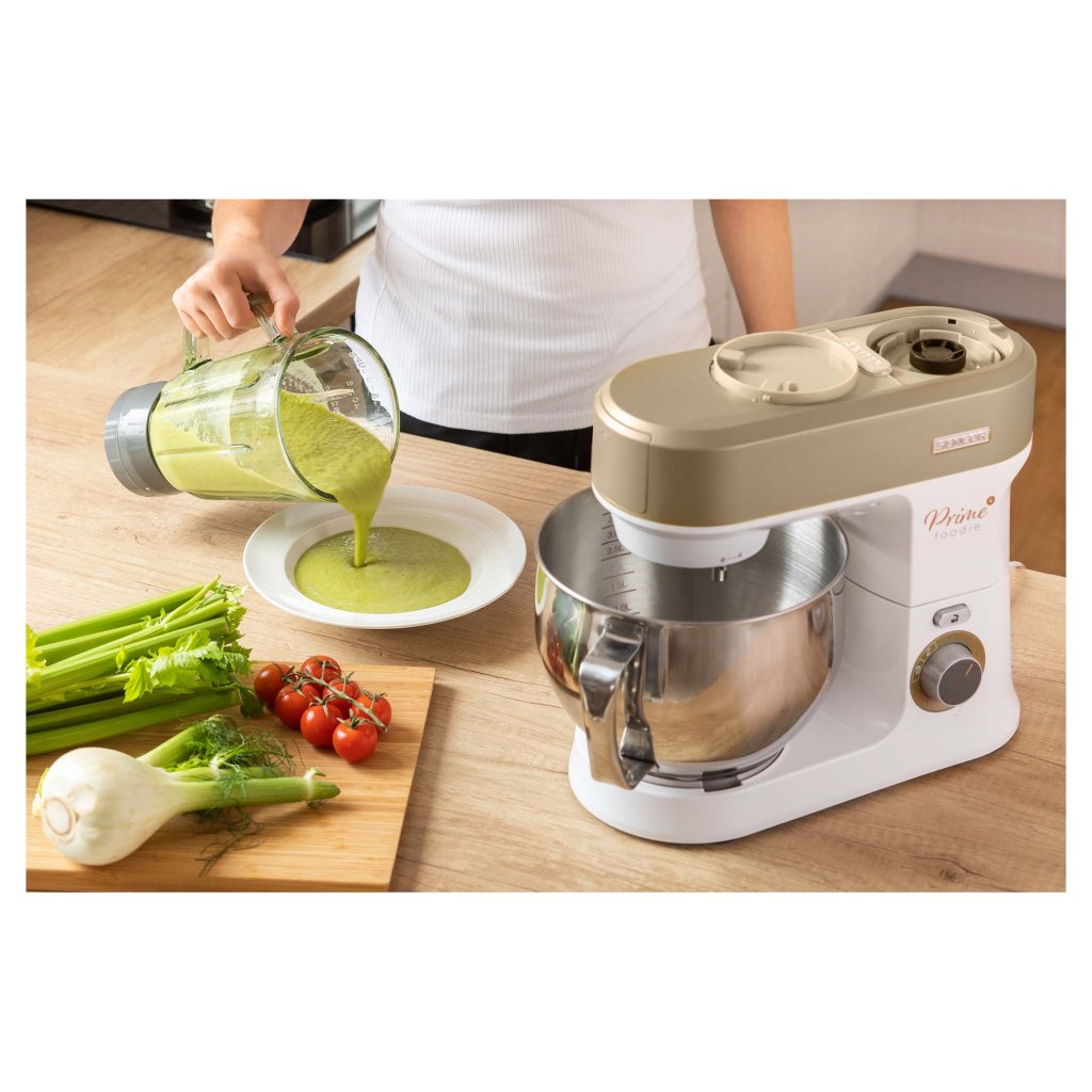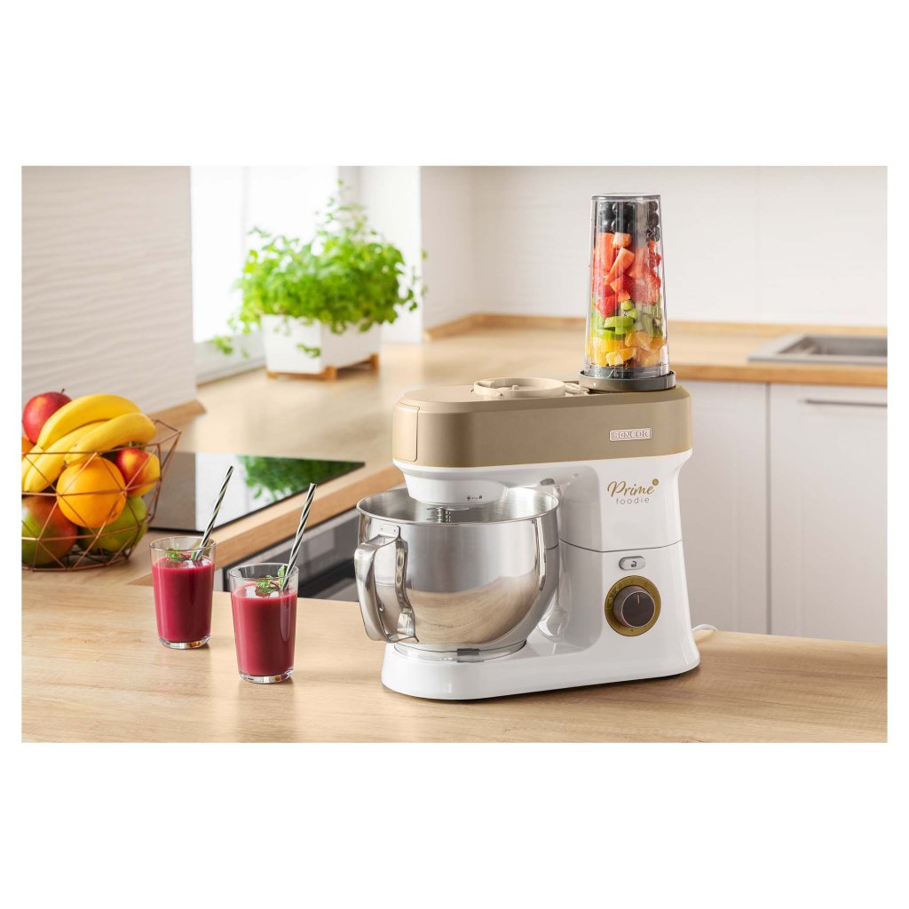 Součástí výbavy je skleněný mixér 1,5 l s titanově potaženým ostřím pro hladké polévky, omáčky a smoothie. Praktická nutri láhev 0,6 l umožní mixovat a vzít nápoj rovnou s sebou. Mlýnek na maso zvládne jemné i hrubé mletí a nástavec na plnění střívek otevře cestu k domácím klobásám.