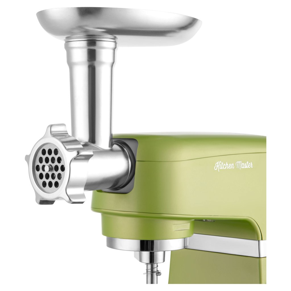 Tritanový mixér 1,5 l (BPA free) s titanovou nožovou jednotkou si poradí s polévkami, pyré, smoothie i ledovou tříští. Masomlýnek umele nahrubo i najemno a nástavec na klobásy usnadní výrobu domácích uzenin. Tvořítko na cukroví přidá čtyři klasické tvary.