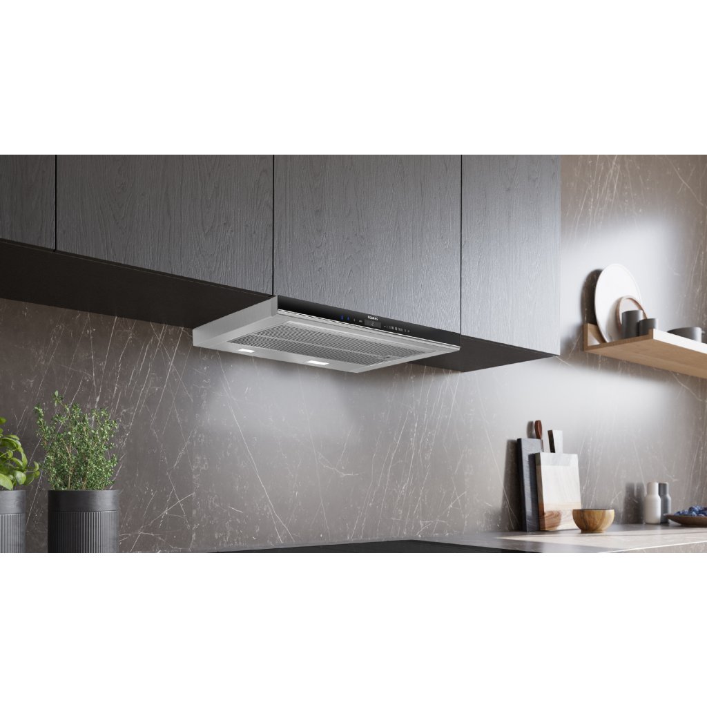 Plochý výsuvný odsavač par s vysokým výkonem a téměř neviditelným umístěním do horní skříňky.